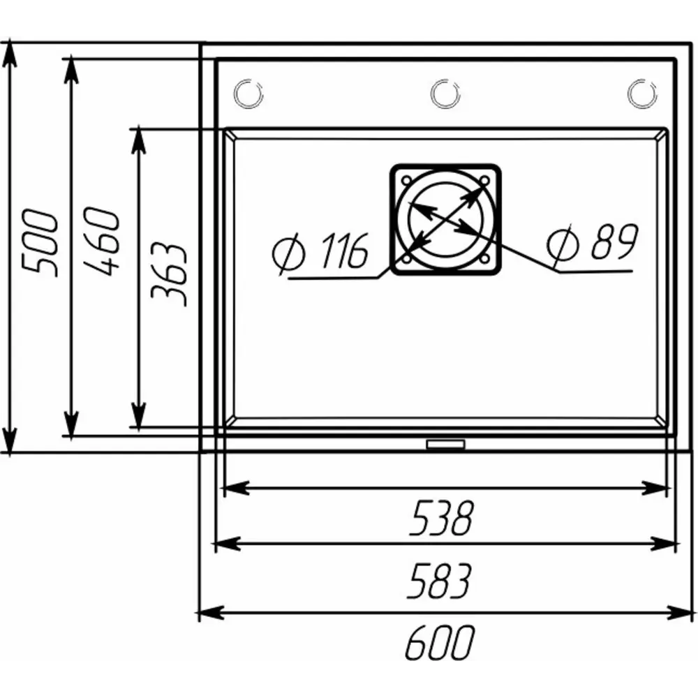 Общий размер мойки (ШхГхВ): 600×500×200 мм.