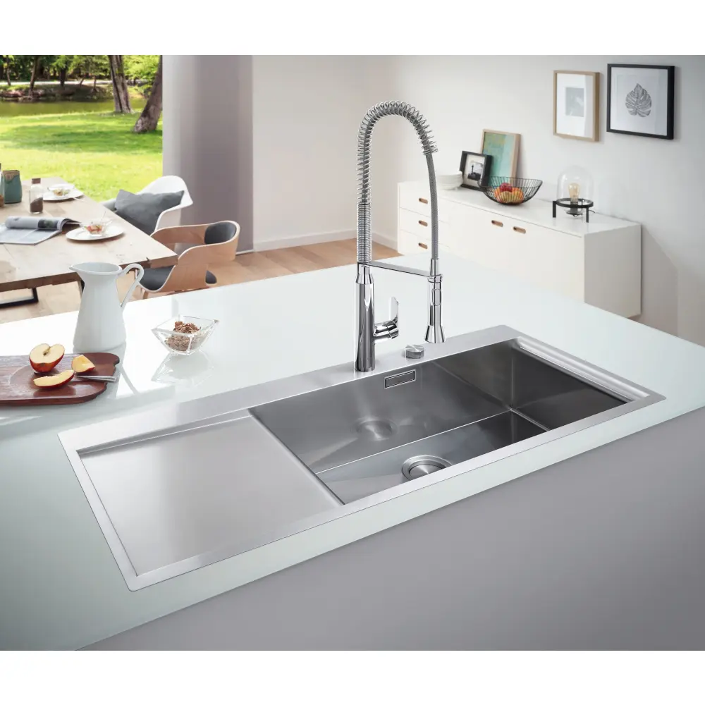 Кухонна мийка Grohe Sink 31582SD0 виготовлена з нержавіючої сталі, що гарантує її надійність і привабливість поверхні. Завдяки системі GROHE QuickFix установлення мийки не візьме багато часу та не потребує додаткового обладнання. Мийка виконана у вигляді чаші з мінімалістичним переливом, скошеним крилом для сушіння посуду та розморожування продуктів. Вона монтується в один рівень зі стільницею. Глибина чаші 20 см робить мийку дуже зручною та практичною. Ізоляція GROHE Whisper.