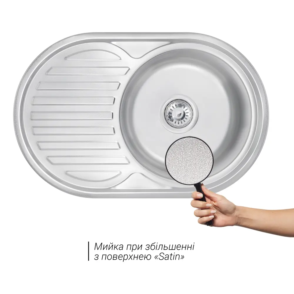 Кухонна мийка Lidz 7750 0,6 мм Satin виготовлена з високоякісної нержавіючої сталі харчової марки, тому виріб прослужить довгі роки. Так само варто відзначити винятковий дизайн який прикрасить будь-яку кухню. Відмінна якість і дизайн мийки дозволять задовольнити найвищі вимоги і створити затишок у вашому домі! Мийка виконана з робочою круглою чашею, ребристим крилом для сушіння посуду і розморожування продуктів. Монтується врізним способом в отвір в стільниці.