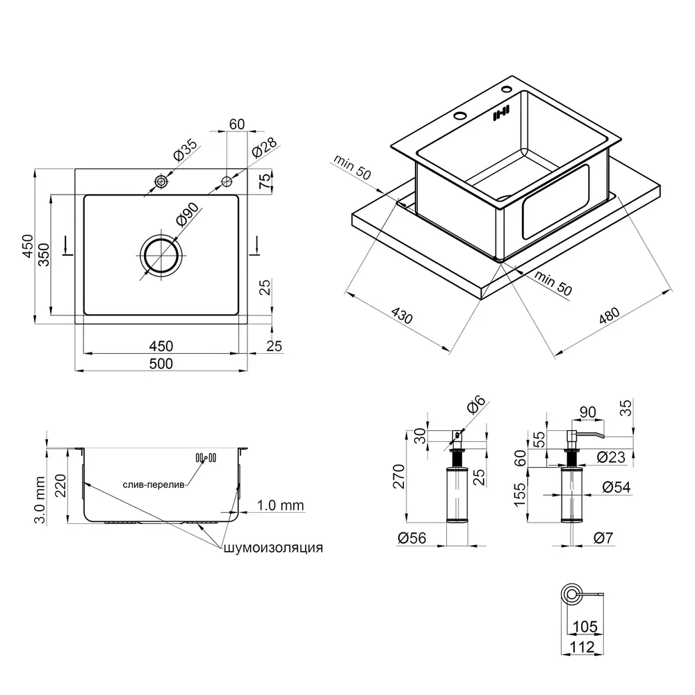 Мийка, Дозатор, Сифон, Слив, Перелив, Кошиковий вентиль, Сушка для посуду, Кріпильні деталі