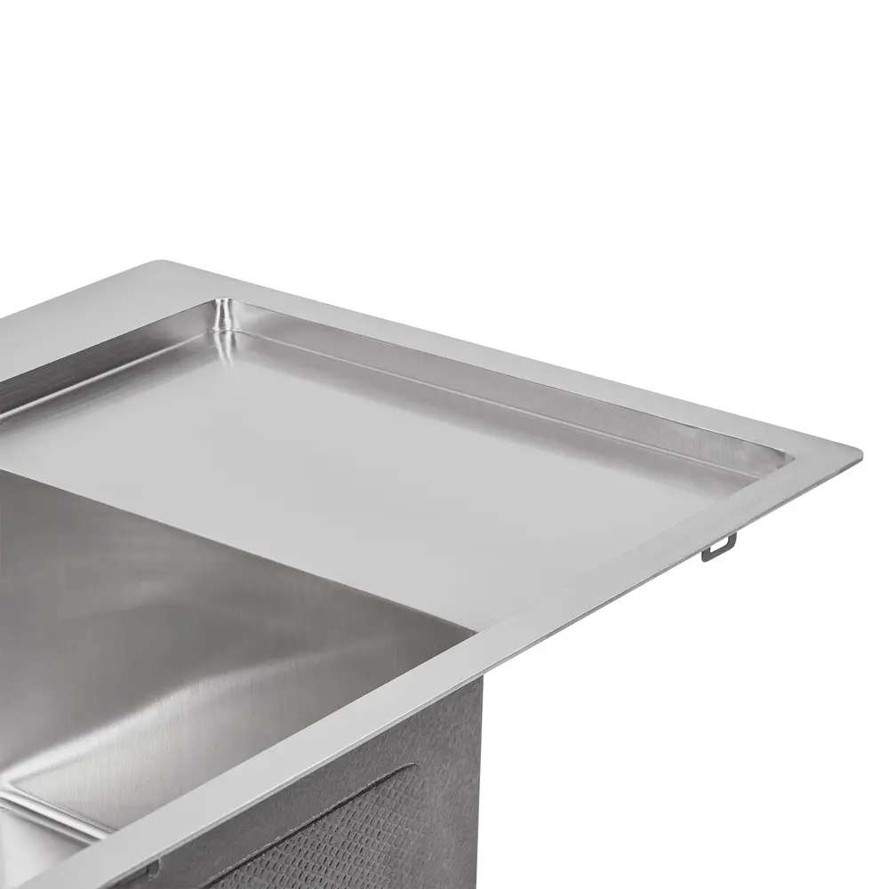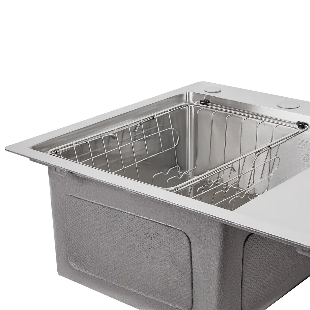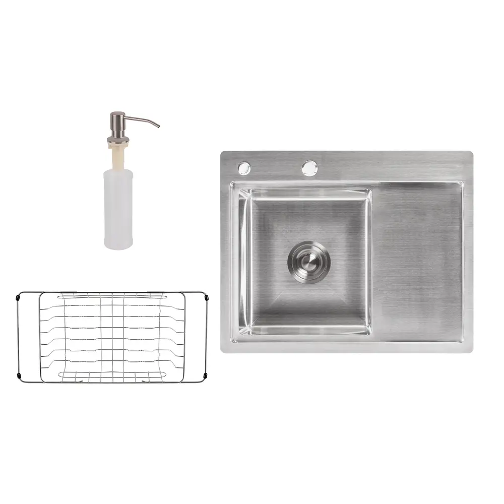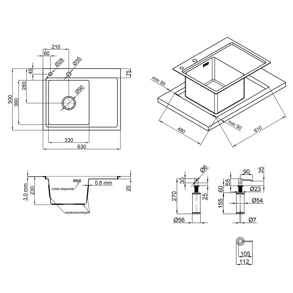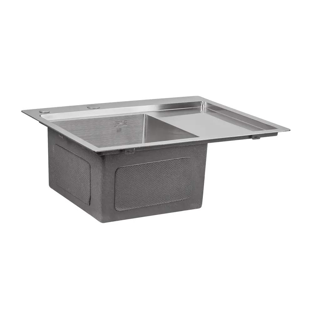 Набор 3 в 1 Lidz кухонная мойка H6350L Brush 3.0 / 0.8 мм + сушилка + дозатор для моющего средства - комплексное решит проблему обустройства моечной зоны. Набор включает в себя стильную прямоугольную кухонную мойку с крылом, изготовленную из прочной нержавеющей стали, компактную сушилку для посуды и дозатор для моющего средства. Интегрированная мойка имеет три варианта установки - вровень со столешницей, над столешницей (аналогично врезным мойкам) и под ней.