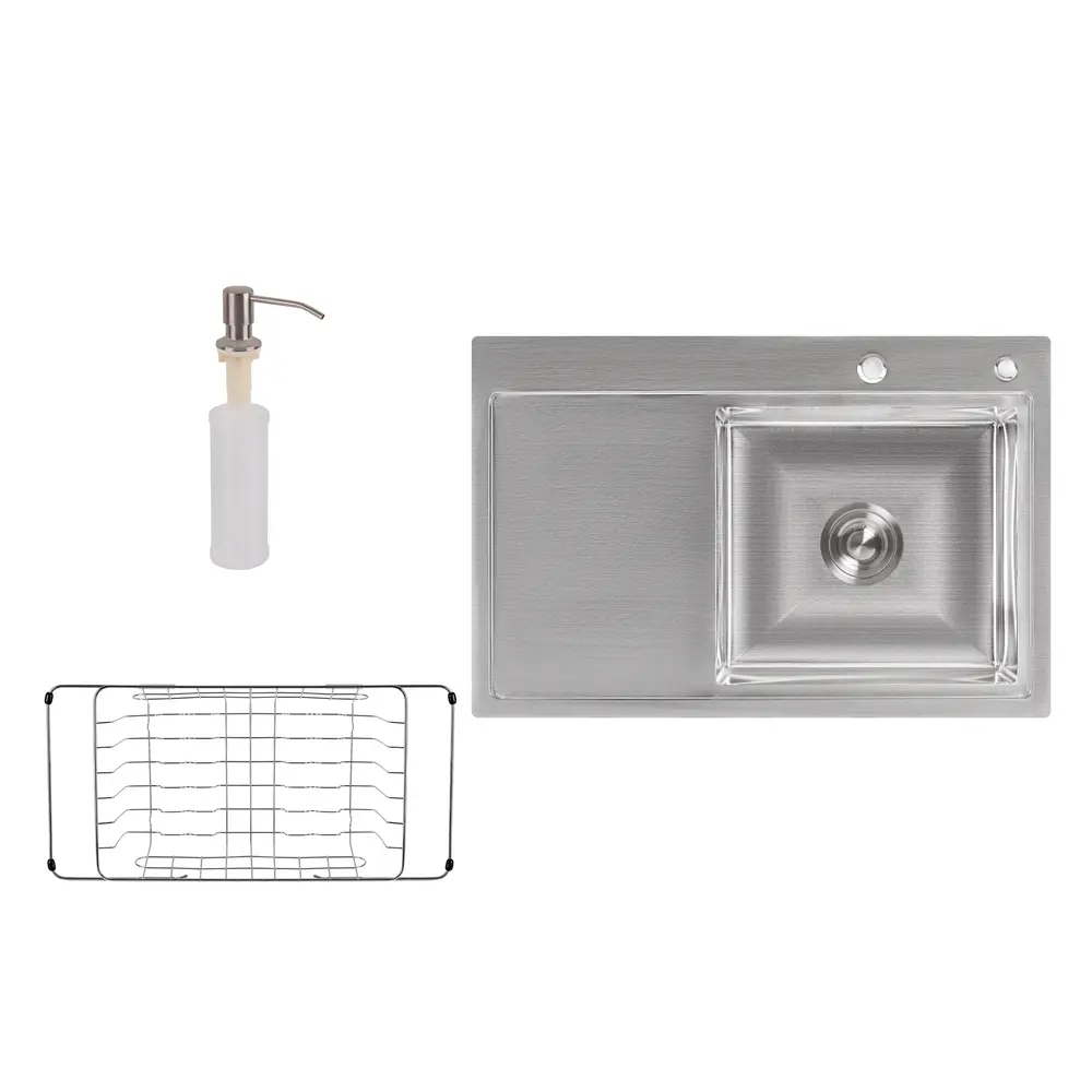Набор 3 в 1 Lidz кухонная мойка H7851R Brush 3.0 / 0.8 мм + сушилка + дозатор для моющего средства - комплексное решит проблему обустройства моечной зоны. Набор включает в себя стильную прямоугольную кухонную мойку, изготовленную из прочной нержавеющей стали, компактную сушилку для посуды и дозатор для моющего средства. Интегрированная мойка имеет три варианта установки - вровень со столешницей, над столешницей (аналогично врезным мойкам) и под ней.