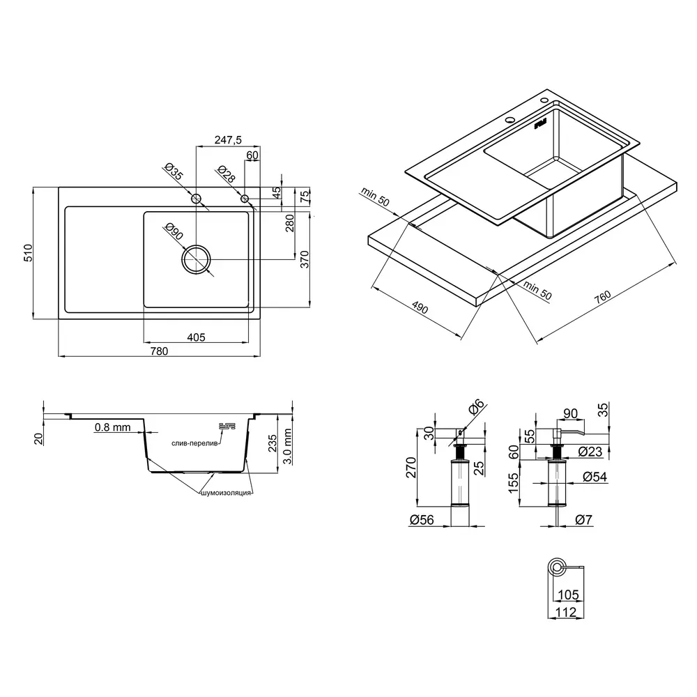 Мийка, Дозатор, Сифон, Слив, Перелив, Кошиковий вентиль, Сушка для посуду, Кріпильні деталі