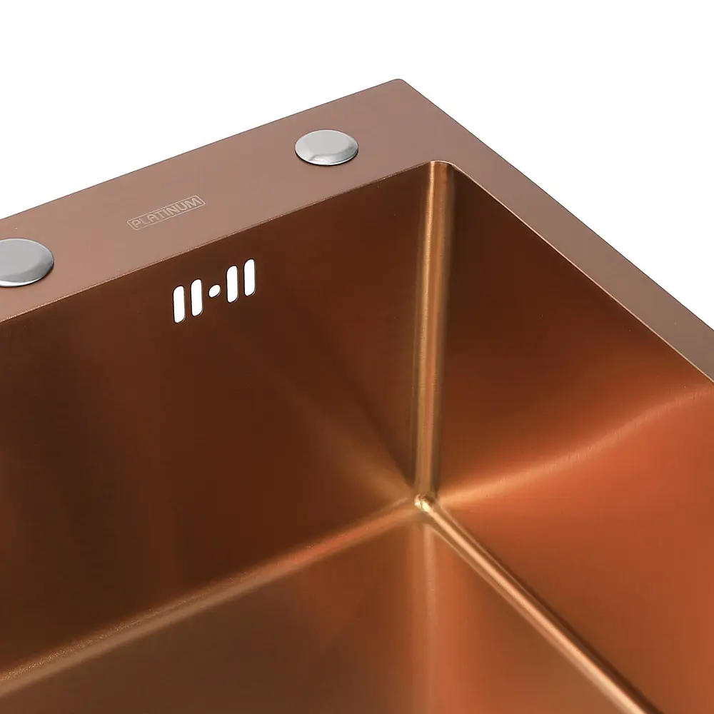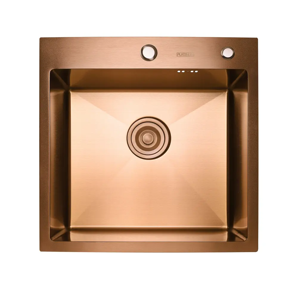 Фактура поверхности: матовая Размер чаши, мм: 450*400 Бренд: PLATINUM Материал ++: Нержавеющая сталь с PVD покрытием Шт. в коробке: 3 шт Ширина мойки, мм: 500 Глубина мойки, мм: 500 Тип установки: Универсальная (на столешницу, под столешницу, в уровень со столешницей) Толщина стали, мм: 3,0 - 1,5 Наличие чаши / рабочей поверхности (сушки): Одна основная чаша без сушки Форма мойки: квадратная Ширина шкафа для монтажа, см: 40-59 Тип мойки: врезная Комплектация к мойке: Корзина, дозатор, сифон Глубина основной чаши, мм: 220 Сифон: Евросифон (широкая горловина, 110 мм) Особенности мойки: Отверстие под смеситель и дозатор Гарантия: 5 лет Расположение чаши : Центральная Размер дополнительной чаши, мм: отсутствует Перелив: боковой Глубина дополнительной чаши, мм: Отсутствует
