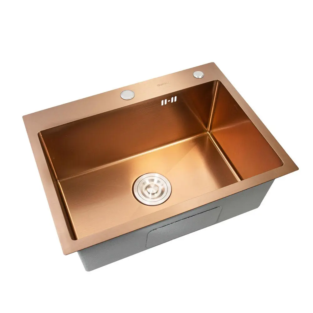 Фактура поверхности: матовая Размер чаши, мм: 530*330 Бренд: PLATINUM Материал ++: Нержавеющая сталь с PVD покрытием Шт. в коробке: 3 шт Ширина мойки, мм: 580 Глубина мойки, мм: 430 Тип установки: Универсальная (на столешницу, под столешницу, в уровень со столешницей) Толщина стали, мм: 3,0 - 1,5 Наличие чаши / рабочей поверхности (сушки): Одна основная чаша без сушки Форма мойки: прямоугольная Ширина шкафа для монтажа, см: 60-75 Тип мойки: врезная Комплектация к мойке: Корзина, дозатор, сифон Глубина основной чаши, мм: 220 Сифон: Евросифон (широкая горловина, 110 мм) Особенности мойки: Отверстие под смеситель и дозатор Гарантия: 5 лет Расположение чаши : Центральная Размер дополнительной чаши, мм: отсутствует Перелив: боковой Глубина дополнительной чаши, мм: Отсутствует