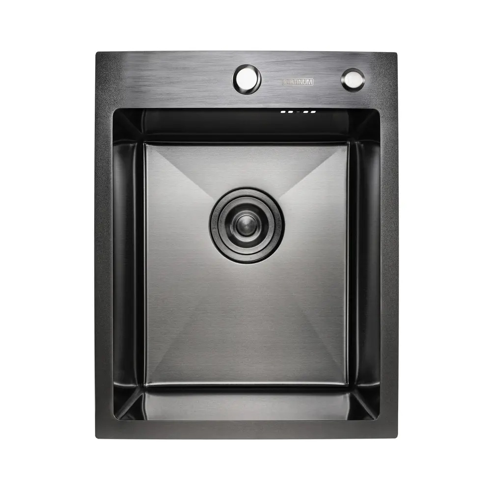 Фактура поверхности: матовая Размер чаши, мм: 350*400 Бренд: PLATINUM Материал ++: Нержавеющая сталь с PVD покрытием Шт. в коробке: 3 шт Ширина мойки, мм: 400 Глубина мойки, мм: 500 Тип установки: Универсальная (на столешницу, под столешницу, в уровень со столешницей) Толщина стали, мм: 3,0 - 1,5 Наличие чаши / рабочей поверхности (сушки): Одна основная чаша без сушки Форма мойки: прямоугольная Ширина шкафа для монтажа, см: 40-59 Тип мойки: врезная Комплектация к мойке: Корзина, дозатор, сифон Глубина основной чаши, мм: 220 Сифон: Евросифон (широкая горловина, 110 мм) Особенности мойки: Отверстие под смеситель и дозатор Гарантия: 5 лет Расположение чаши : Центральная Размер дополнительной чаши, мм: отсутствует Перелив: боковой Глубина дополнительной чаши, мм: Отсутствует