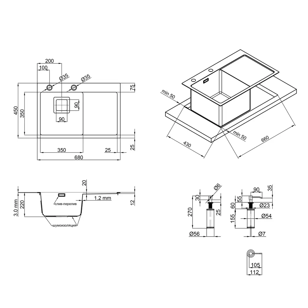 Мийка, Дозатор, Сифон, Слив, Перелив, Кошиковий вентиль, Сушка для посуду, Кріпильні деталі