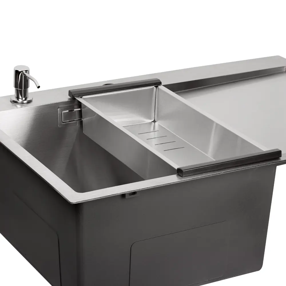 Набор 3 в 1 Qtap кухонная мойка DK6845L 3.0 / 1.2 мм Satin + сушилка + дозатор для моющего средства поможет решить вопрос обустройства моечной зоны. В состав набора входит современная прямоугольная кухонная мойка, изготовленная из прочной нержавеющей стали, компактная сушилка для посуды и дозатор для моющего средства. Набор способен удовлетворить самые высокие требования, ведь все изделия изготовлены из качественных материалов, что увеличивает срок эксплуатации.