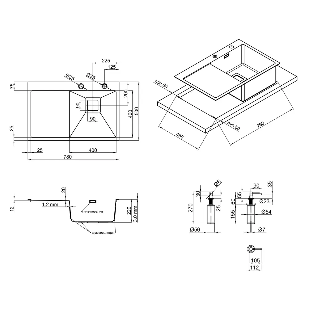 Мийка, Дозатор, Сифон, Слив, Перелив, Кошиковий вентиль, Сушка для посуду, Кріпильні деталі