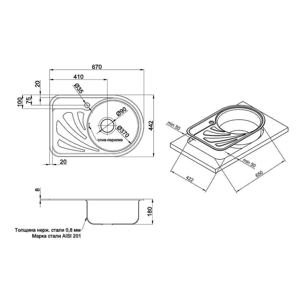 Кухонная мойка ULA 7111 ZS Satin 08 (R) изготовлена из высококачественной нержавеющей стали пищевой марки, поэтому прослужит долгие годы. Она сертифицирована, легко переносит воздействие кипятка и пара температурой до 140 ° С. Матовая поверхность гладкая, быстро моется и всегда имеет привлекательный вид. Изделие выполнено из круглой чашей, ребристым крылом для сушки посуды или размораживания продуктов и поверхностью с отверстием под смеситель. Монтируется врезным способом в отверстие в столешнице.