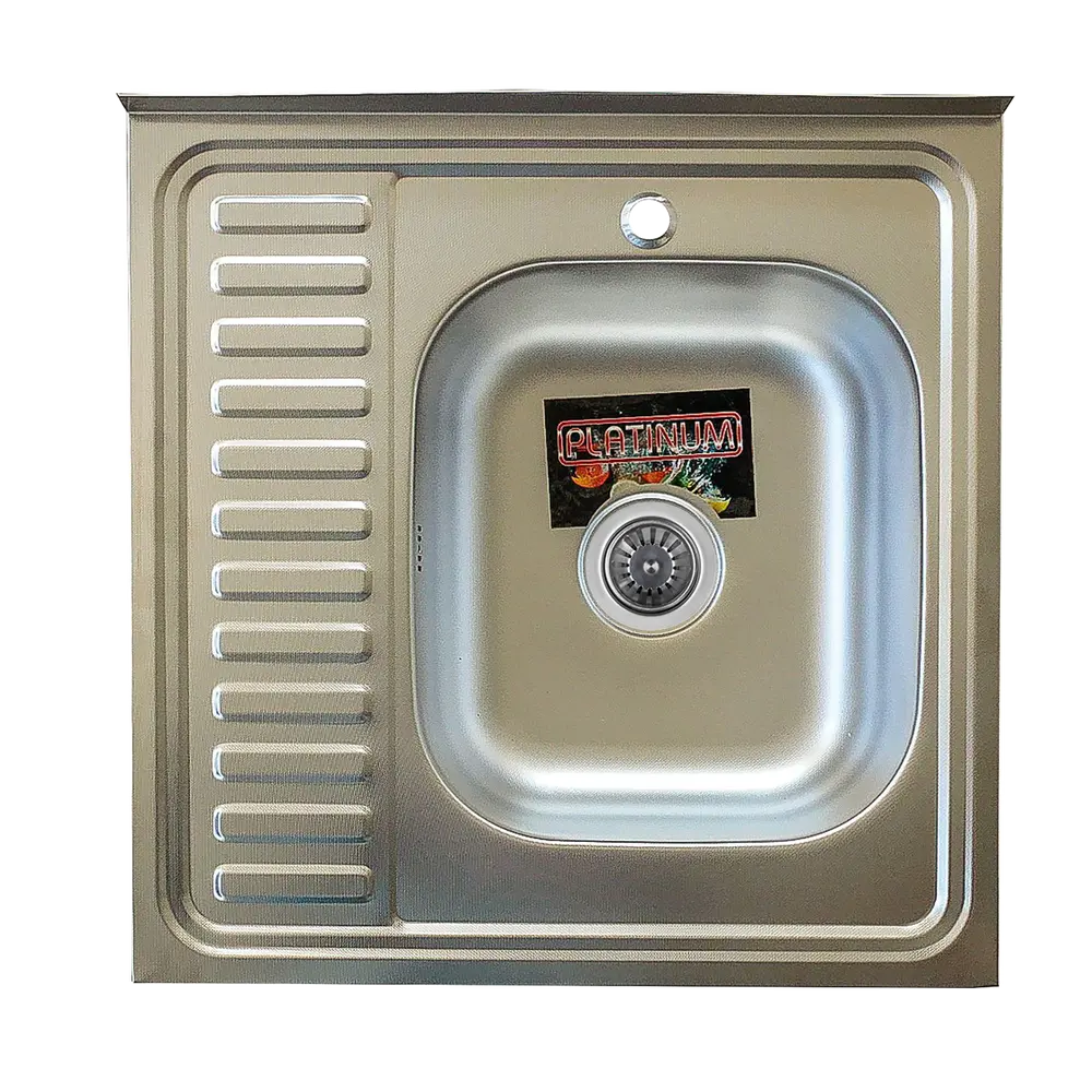 Фактура поверхности: матовая Размер чаши, мм: 400*400 Бренд: PLATINUM Материал ++: Нержавеющая сталь SUS 201 Шт. в коробке: 15 шт Ширина мойки, мм: 600 Глубина мойки, мм: 600 Тип установки: на тумбу Толщина стали, мм: 0,5 Наличие чаши / рабочей поверхности (сушки): Одна основная чаша с сушкой Форма мойки: прямоугольная Ширина шкафа для монтажа, см: 60-75 Тип мойки: накладная Комплектация к мойке: без комплектации Глубина основной чаши, мм: 160 Сифон: Сифон с узкой горловиной (65 мм) Особенности мойки: Отверстие под смеситель Гарантия: 60 дней Расположение чаши : чаша дело Размер дополнительной чаши, мм: отсутствует Перелив: отсутствует Глубина дополнительной чаши, мм: Отсутствует