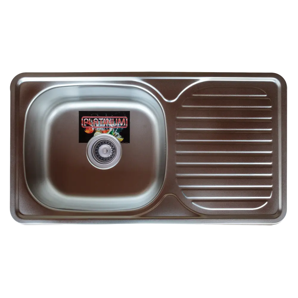 Фактура поверхности: глянцевая Размер чаши, мм: 390*340 Бренд: PLATINUM Материал ++: Нержавеющая сталь SUS 201 Шт. в коробке: 10 шт Ширина мойки, мм: 760 Глубина мойки, мм: 420 Тип установки: на столешницу Толщина стали, мм: 0,8 Наличие чаши / рабочей поверхности (сушки): Одна основная чаша с сушкой Форма мойки: прямоугольная Ширина шкафа для монтажа, см: 76-90 Тип мойки: врезная Комплектация к мойке: сифон крепления Глубина основной чаши, мм: 180 Сифон: Евросифон (широкая горловина, 110 мм) Особенности мойки: Без дополнительных отверстий Гарантия: 60 дней Расположение чаши : Универсальная Размер дополнительной чаши, мм: отсутствует Перелив: боковой Глубина дополнительной чаши, мм: Отсутствует