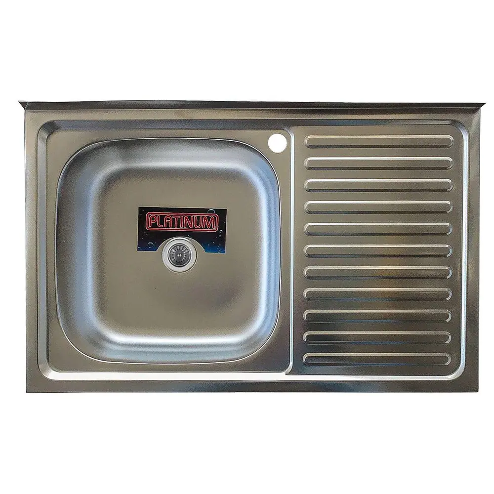 Фактура поверхности: матовая Размер чаши, мм: 400*400 Бренд: PLATINUM Материал ++: Нержавеющая сталь SUS 201 Шт. в коробке: 20 шт Ширина мойки, мм: 800 Глубина мойки, мм: 500 Тип установки: на тумбу Толщина стали, мм: 0,5 Наличие чаши / рабочей поверхности (сушки): Одна основная чаша с сушкой Форма мойки: прямоугольная Ширина шкафа для монтажа, см: 76-90 Тип мойки: накладная Комплектация к мойке: без комплектации Глубина основной чаши, мм: 160 Сифон: Евросифон (широкая горловина, 110 мм) Особенности мойки: Отверстие под смеситель Гарантия: 60 дней Расположение чаши : чаша дело Размер дополнительной чаши, мм: отсутствует Перелив: отсутствует Глубина дополнительной чаши, мм: Отсутствует