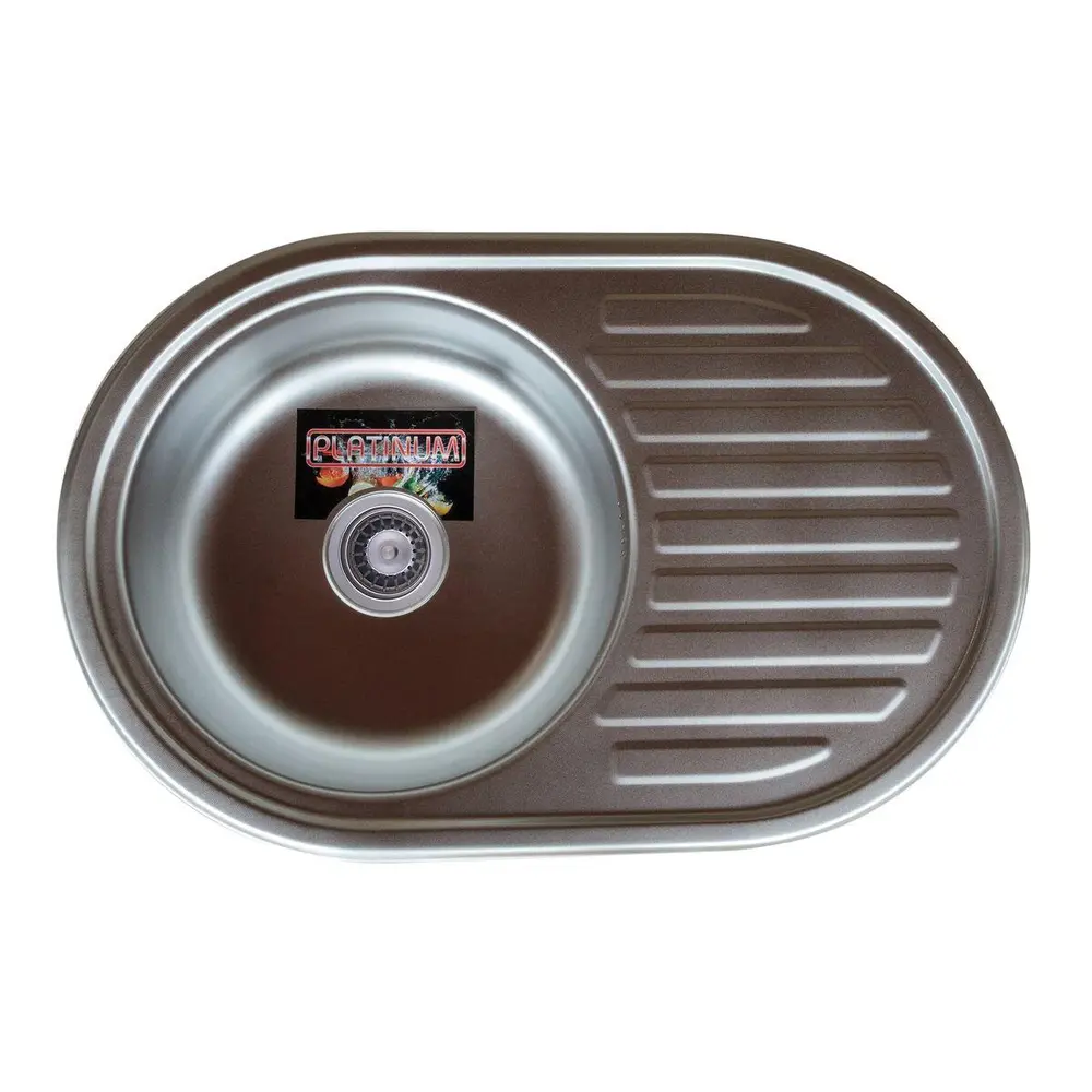 Фактура поверхности: рифленая Размер чаши, мм: 400*400 Бренд: PLATINUM Материал ++: Нержавеющая сталь SUS 201 Шт. в коробке: 10 шт Ширина мойки, мм: 770 Глубина мойки, мм: 500 Тип установки: на столешницу Толщина стали, мм: 0,8 Наличие чаши / рабочей поверхности (сушки): Одна основная чаша с сушкой Форма мойки: овальная Ширина шкафа для монтажа, см: 76-90 Тип мойки: врезная Комплектация к мойке: сифон крепления Глубина основной чаши, мм: 180 Сифон: Евросифон (широкая горловина, 110 мм) Особенности мойки: Без дополнительных отверстий Гарантия: 60 дней Расположение чаши : Универсальная Размер дополнительной чаши, мм: отсутствует Перелив: боковой Глубина дополнительной чаши, мм: Отсутствует