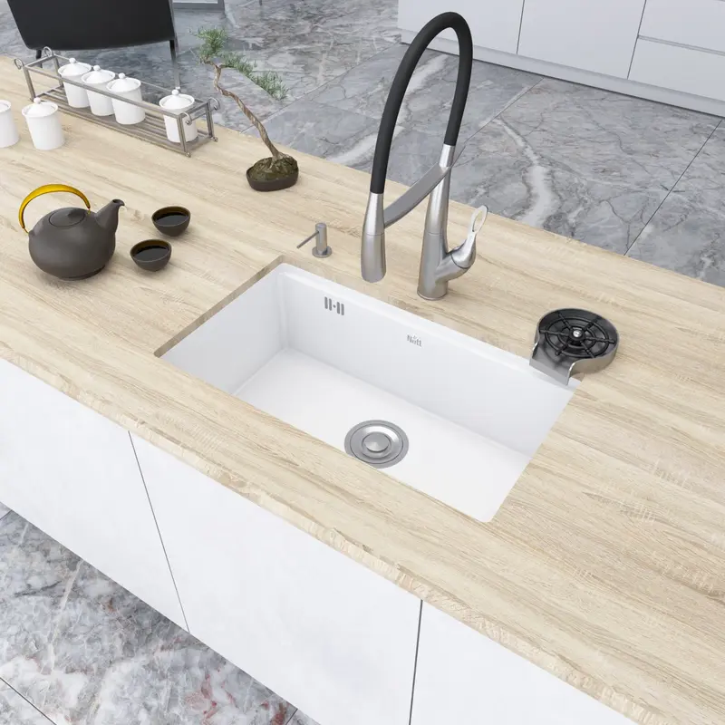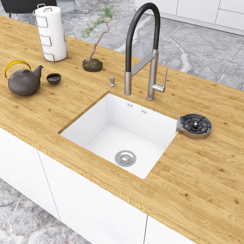 • Вбудований монтаж: Передбачає встановлення мийки під поверхнею стільниці. Під час вбудовування сантехніку під стільницю необхідно встановити підтримуючі конструкції, які забезпечують її стійкість, або якісне кріплення на спеціальні клеї та кріплення. Цей метод монтажу забезпечує мінімальне використання простору.
