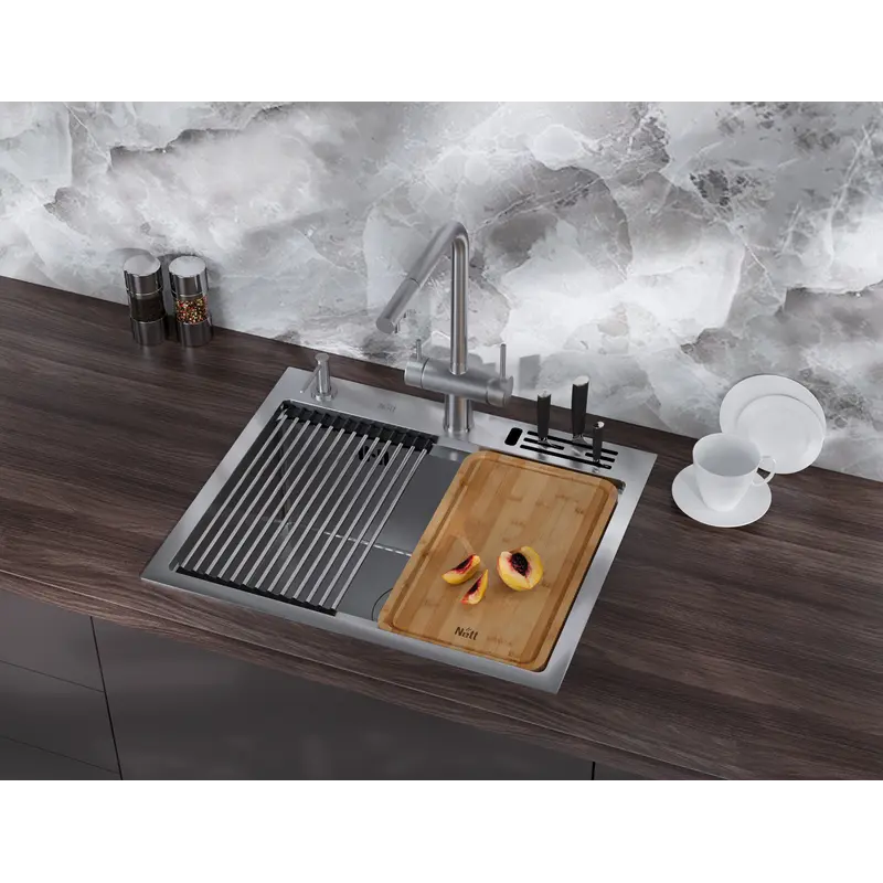 •    Трьохчашеві мийки: Ця конструкція складається з трьох чаш, що дозволяє виконувати ще більше робіт одночасно, таких як миття посуду, овочів та м'яса.