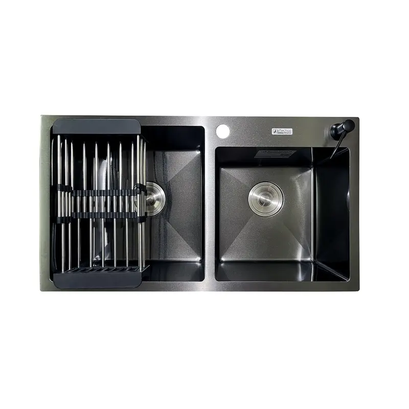 Дуже стильна мийка, виглядає дорого і сучасно на кухні. Чорне PVD-покриття гарно блищить і не залишає подряпин, навіть після активного використання. Розмір оптимальний – не займає зайвого місця, але чаша глибока, посуд зручно мити. Догляд простий – достатньо протерти вологою ганчіркою, і мийка як нова.