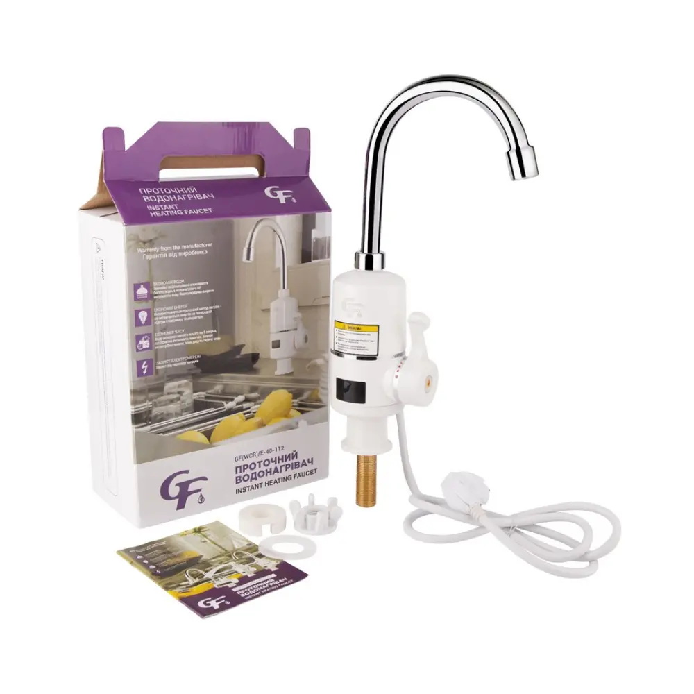Кран для кухни проточный GF (WCR) / E-40-112 изготовлен из нержавеющей стали и ABS пластика. Предназначен для быстрого нагрева проточной воды для бытовых целей. Подключается к магистрали холодного водоснабжения с помощью гибкого шланга диаметром 1/2 "с давлением от 0.04 до 0.5 МПа и бытовой электрической сети 220 В, 50 Гц.