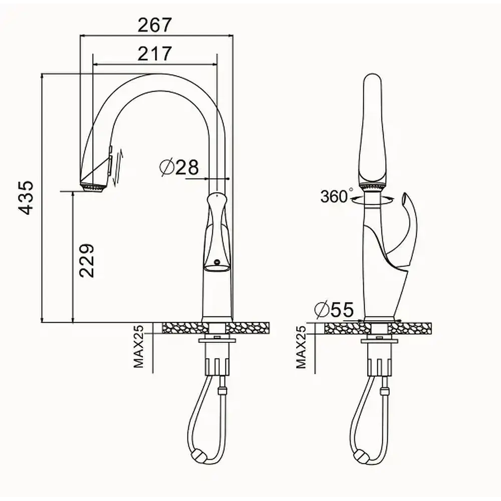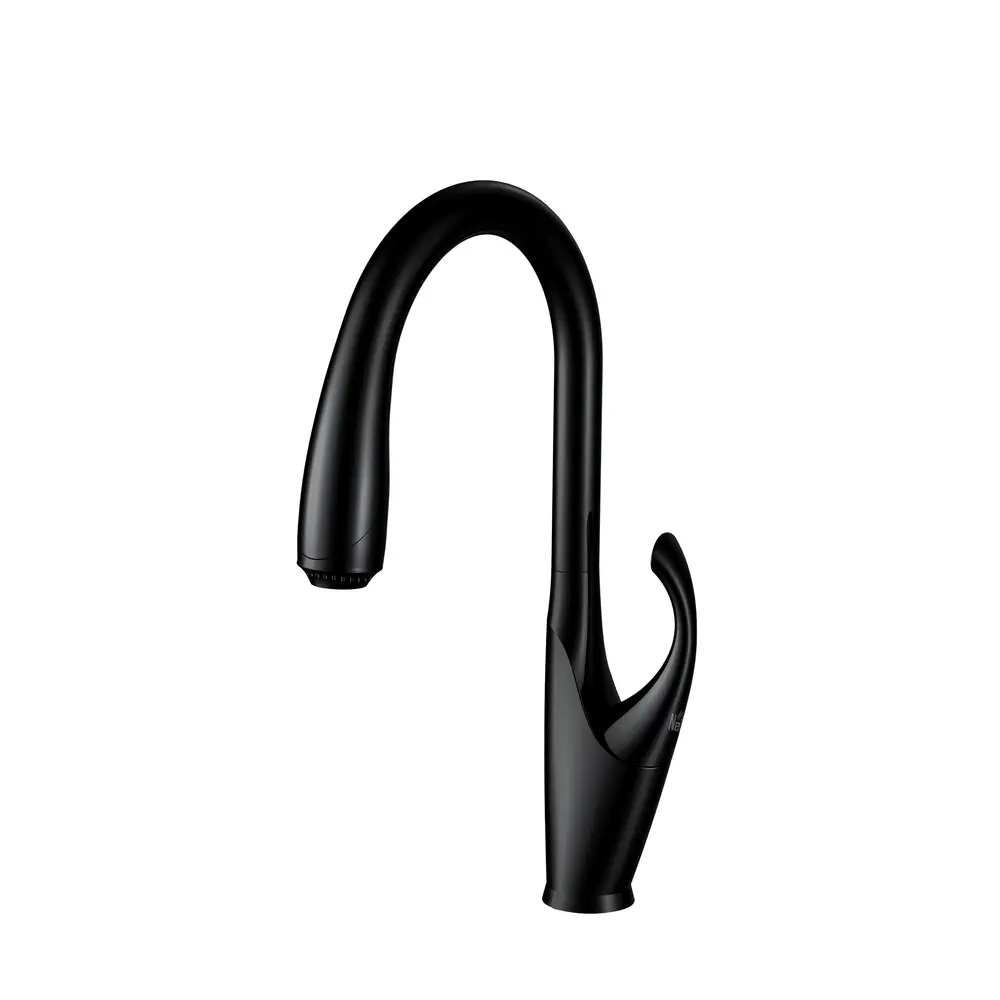 Кран для кухні має висувний розпилювач, який безперешкодно повертається у вихідне положення плавно і впевнено. Гравітаційна система розташована всередині носика надійно фіксує розпилювач на місце.