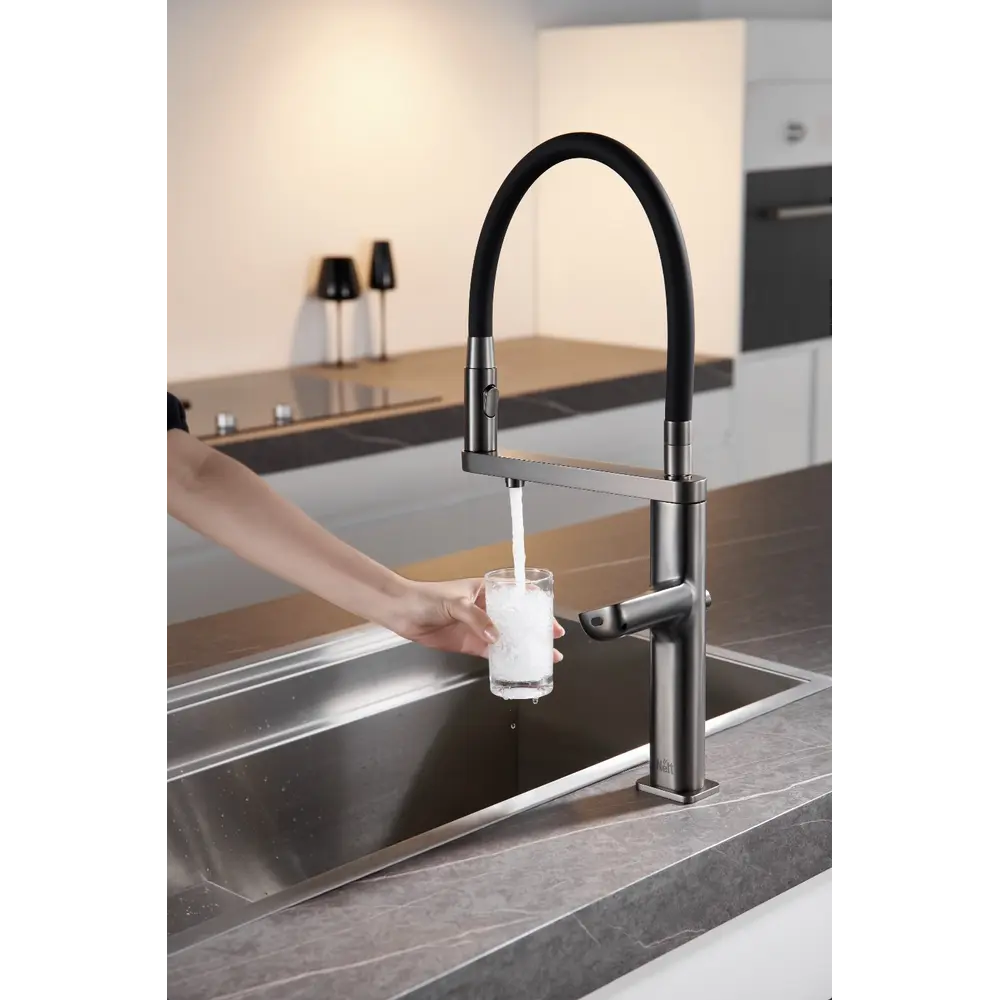 Кухонний змішувач має спеціальну кнопку для подачі питної води. Кнопка реалізована в такому місці, щоб вам було зручно їй керувати, в той же час не псувало зовнішній вигляд змішувача.