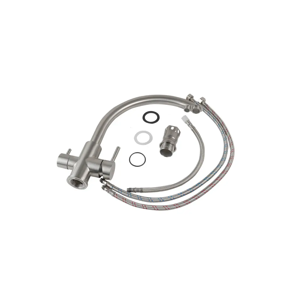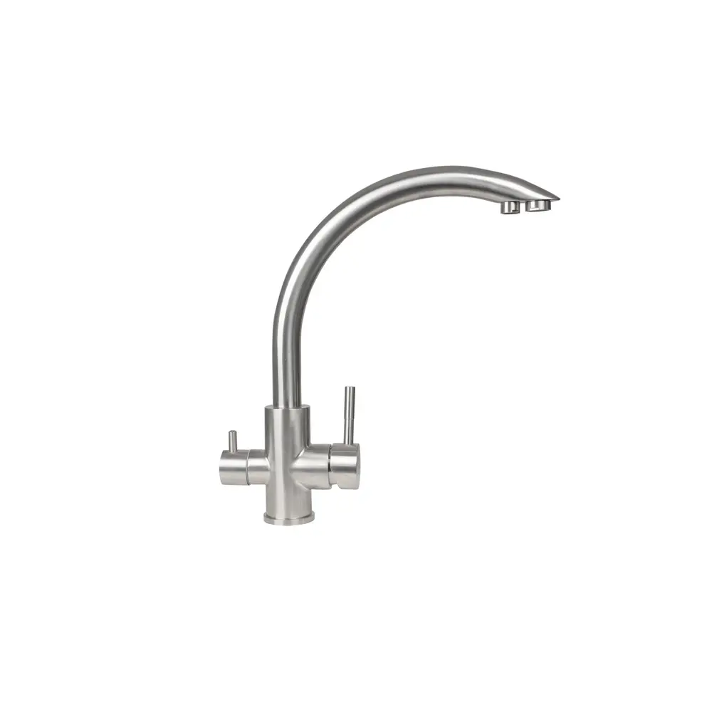 Бренд: GERMECE Тип смесителя: Смеситель кухонный Тип выброса : поворотный Материал ++: Нержавеющая сталь SUS 304 Высота смесителя, мм: 340 Картридж: 35 Крепления: гайка Длина гибкой подводки, мм: 500 Шт. в коробке: 12 шт Шт. в упаковке: 1 шт Высота от основания до носике, мм: 290,5 Цвет излива: Нержавеющая сталь Вид смесителя: Двухрычажная Комплектация: Смеситель, крепления, гибкая подводка Подключение: К фильтру и водопровода Вид монтажа: Внешний Гарантия: 1 год