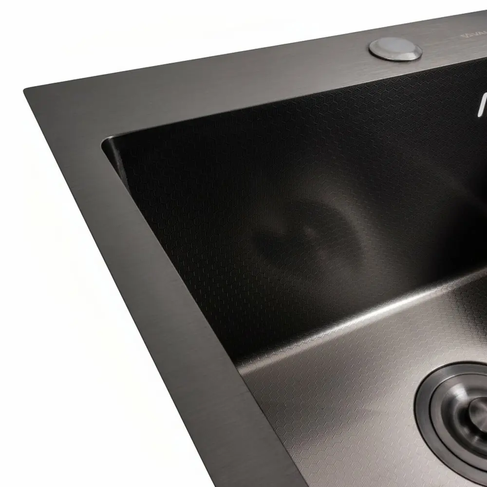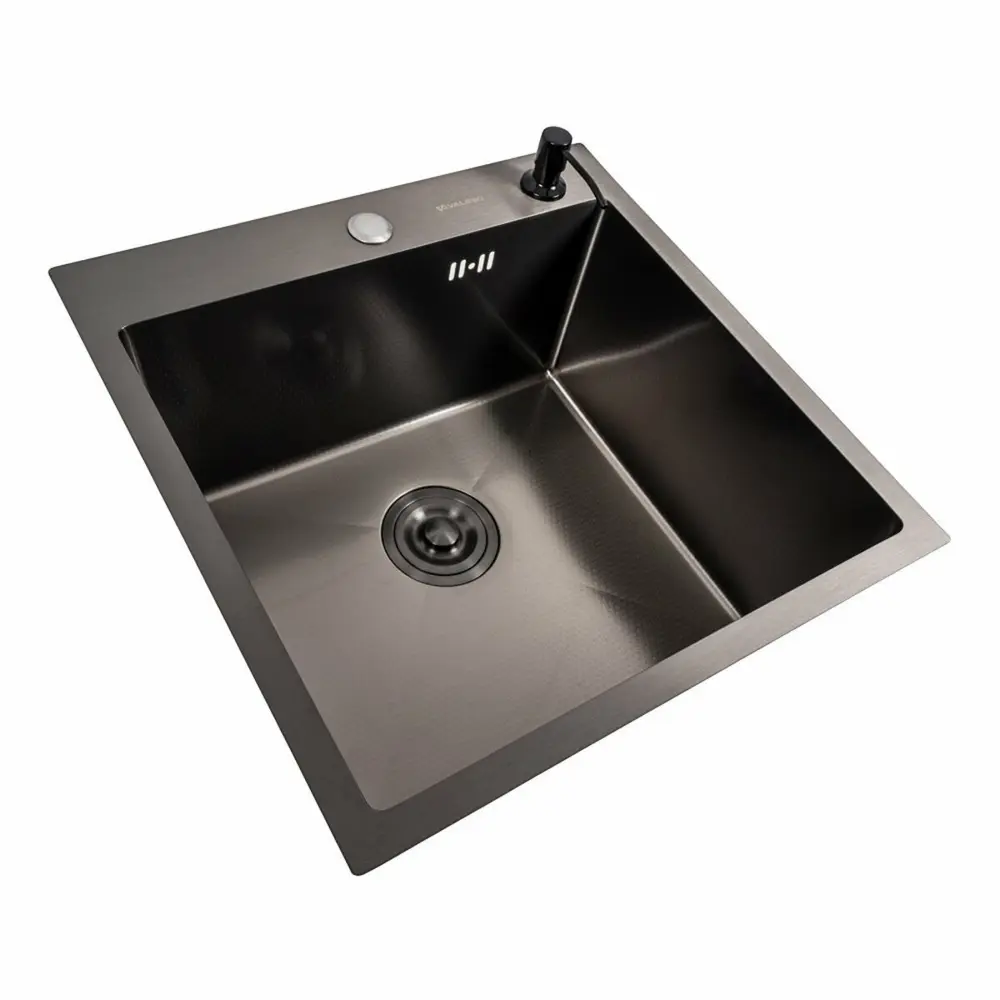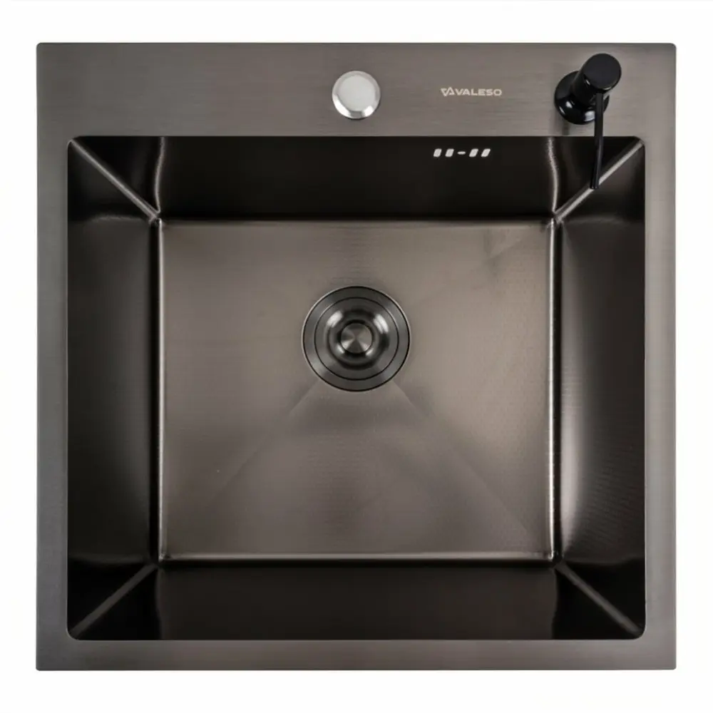 Кухонна мийка 50*50 PVD DECOR чорна VALESO Handmade (сифон круглий, 3,0/0,8) це відмінне стильне рішення для кухні невеликих та середніх розмірів. Лаконічний дизайн квадратної форми добре пасує різним інтер’єрам кухні.
