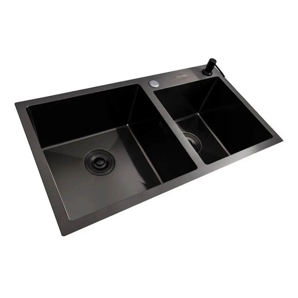 Кухонна мийка 78*43 PVD чорна на дві чаші VALESO Handmade (3.0/0.8) це відмінне стильне рішення для кухні. Лаконічний дизайн прямокутної форми з двома чашами добре пасує різним інтер’єрам кухні та робить мийку функціональною.