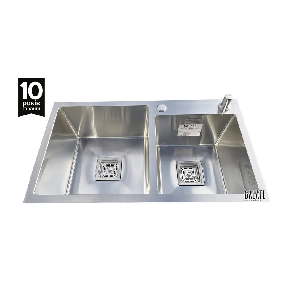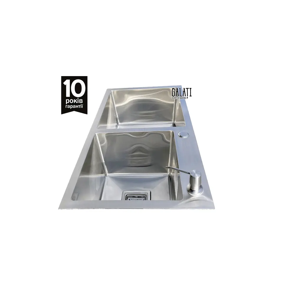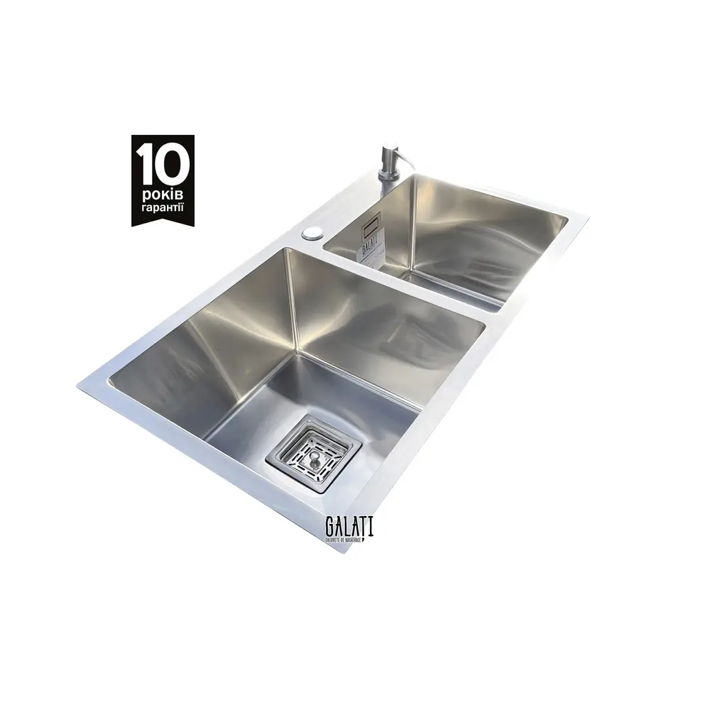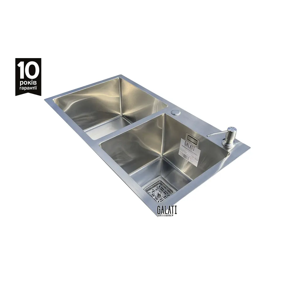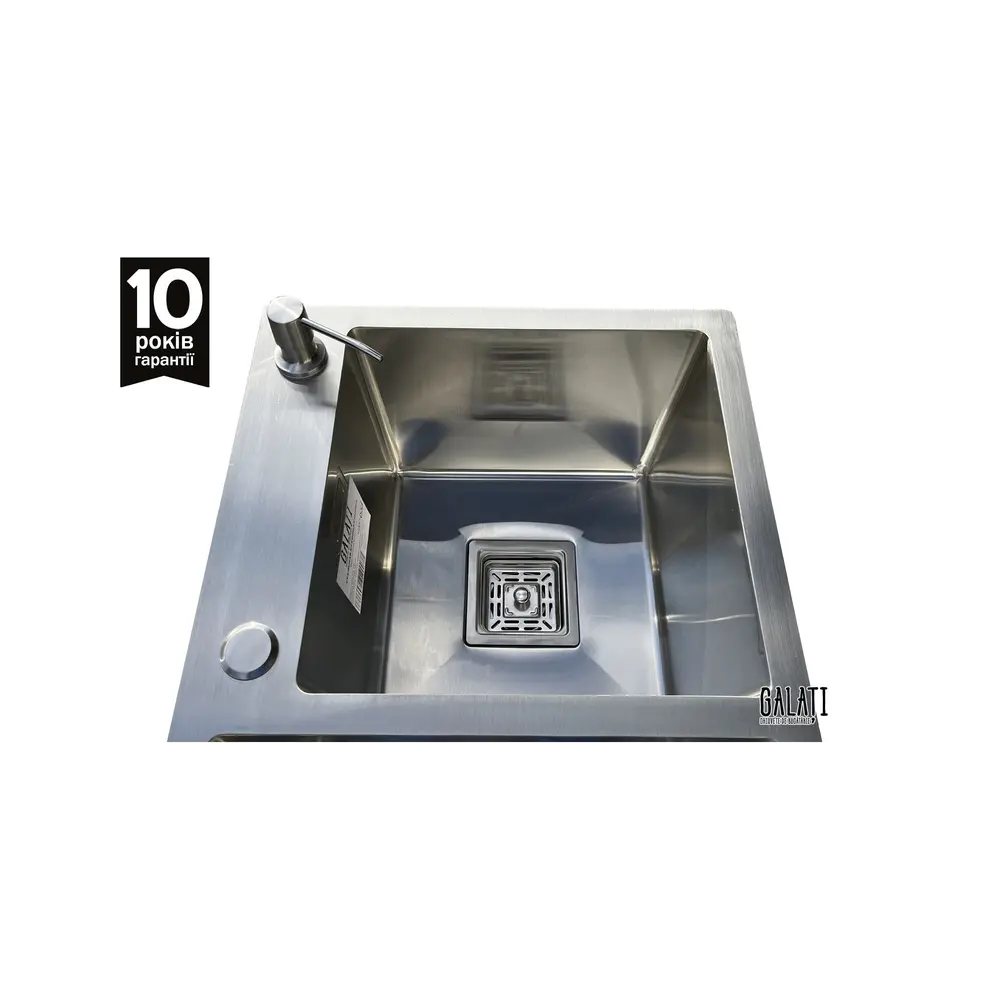 Комплектація: кухонна мийка, сифон, армованний гофро-шланг, корзина з нержавіючої сталі та дозатор для рідкого миючого засобу