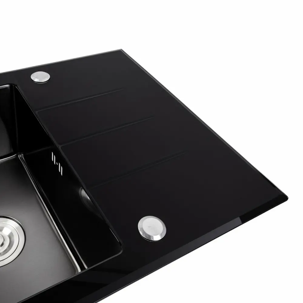 Мийка виготовлена з високоякісної нержавіючої сталі з PVD покриттям чорного кольору, що забезпечує її довговічність та стійкість до подряпин. Скляна поверхня додає їй вишуканого вигляду, що підкреслить стиль вашої кухні.