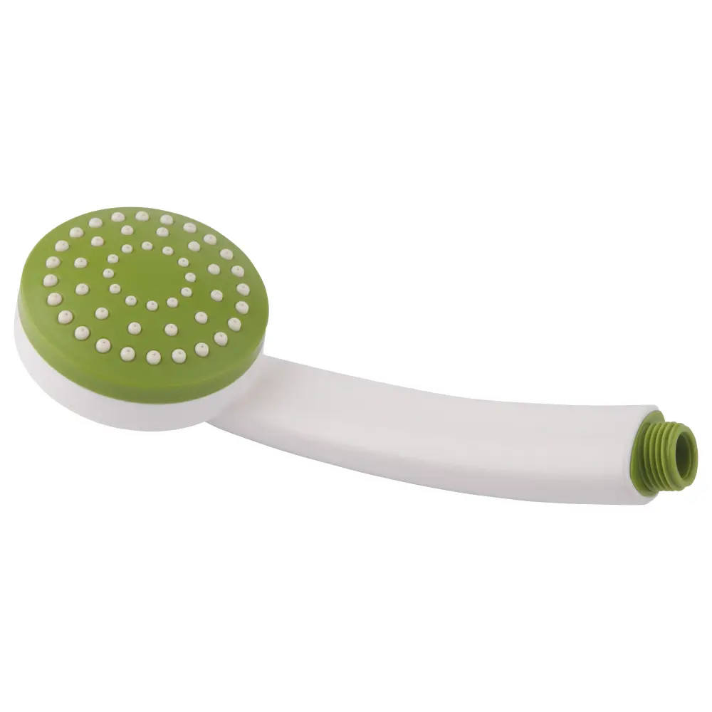 Лійка для ручного душу GF (CRM)-SH-107 виконана з вигнутою ручкою з пластику білого кольору з салатовою вставкою. Вона монтується без особливих зусиль та необхідності додаткових підручних засобів. Для підключення до душового шланга є підвід з зовнішньою різьбою салатового кольору. Лійка сумісна з усіма гнучкими шлангами для душу.