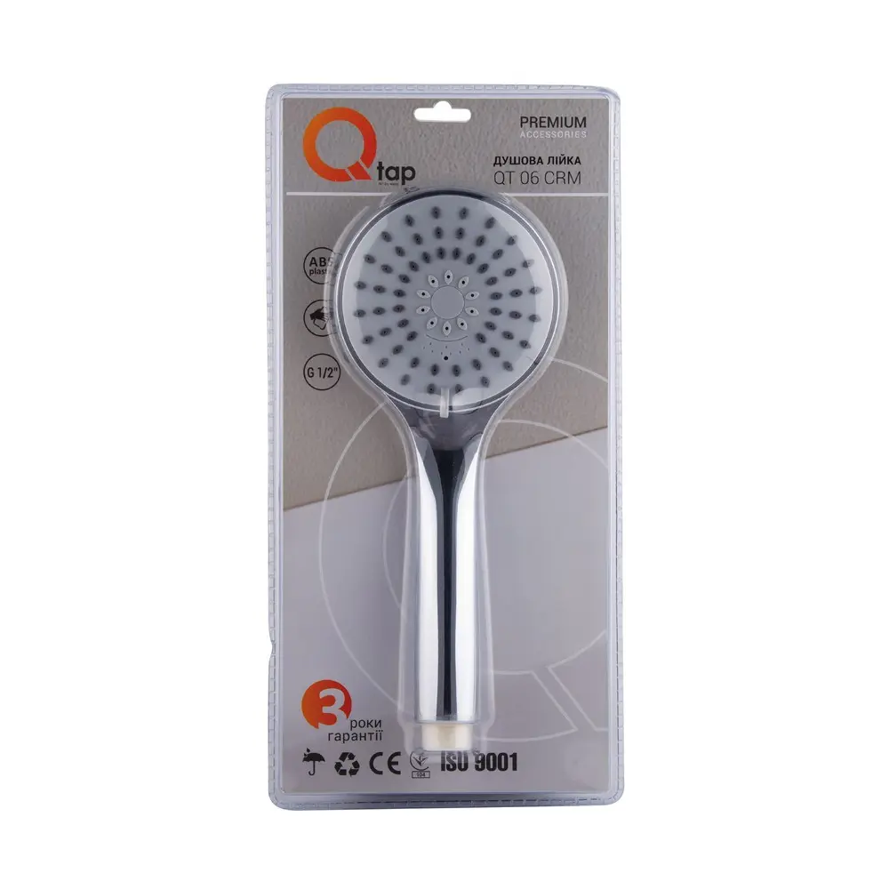 Лійка Qtap 06виконана з ABS пластику з хромованим покриттям, тому поверхня блискуча, не іржавіє, не боїться гідроударів й перепаду температур, а також не облазить від агресивних миючих засобів. Для підключення до душового шланга є підвід з зовнішньою різьбою. Завдяки універсальному діаметру лійка сумісна з усіма гнучкими шлангами для душу. Монтується без особливих зусиль та додаткових підручних засобів. У виробі передбачено 6 типів струменя з крутним диском для зміни режиму.