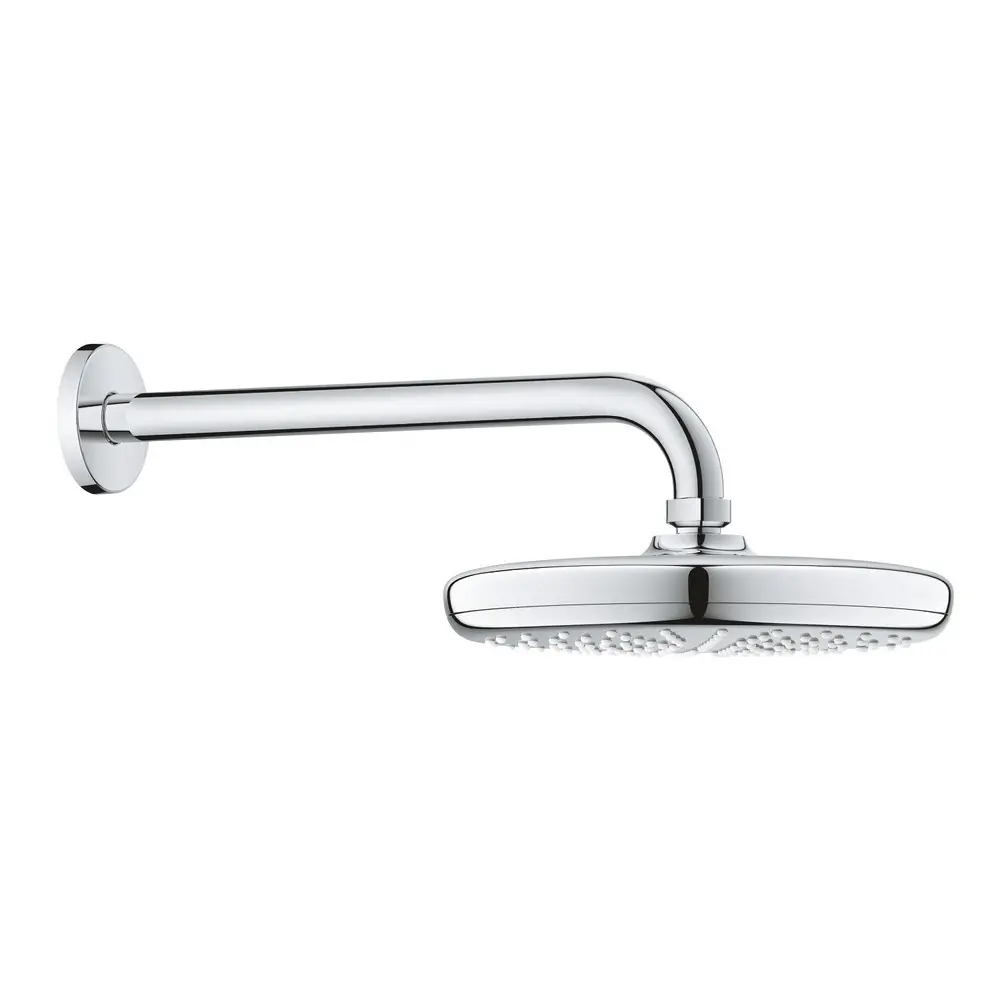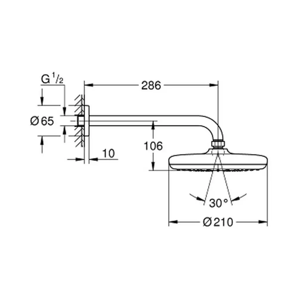 Лейка для верхнего душа Grohe Tempesta 210 26411000 и душевой кронштейн длиной 286 мм выполнены из латуни, которая устойчива к коррозии и износу. Лейка монтируется без особых усилий и дополнительных подручных средств. В ней предусмотрен один тип струи, где Rain - равномерное поток.