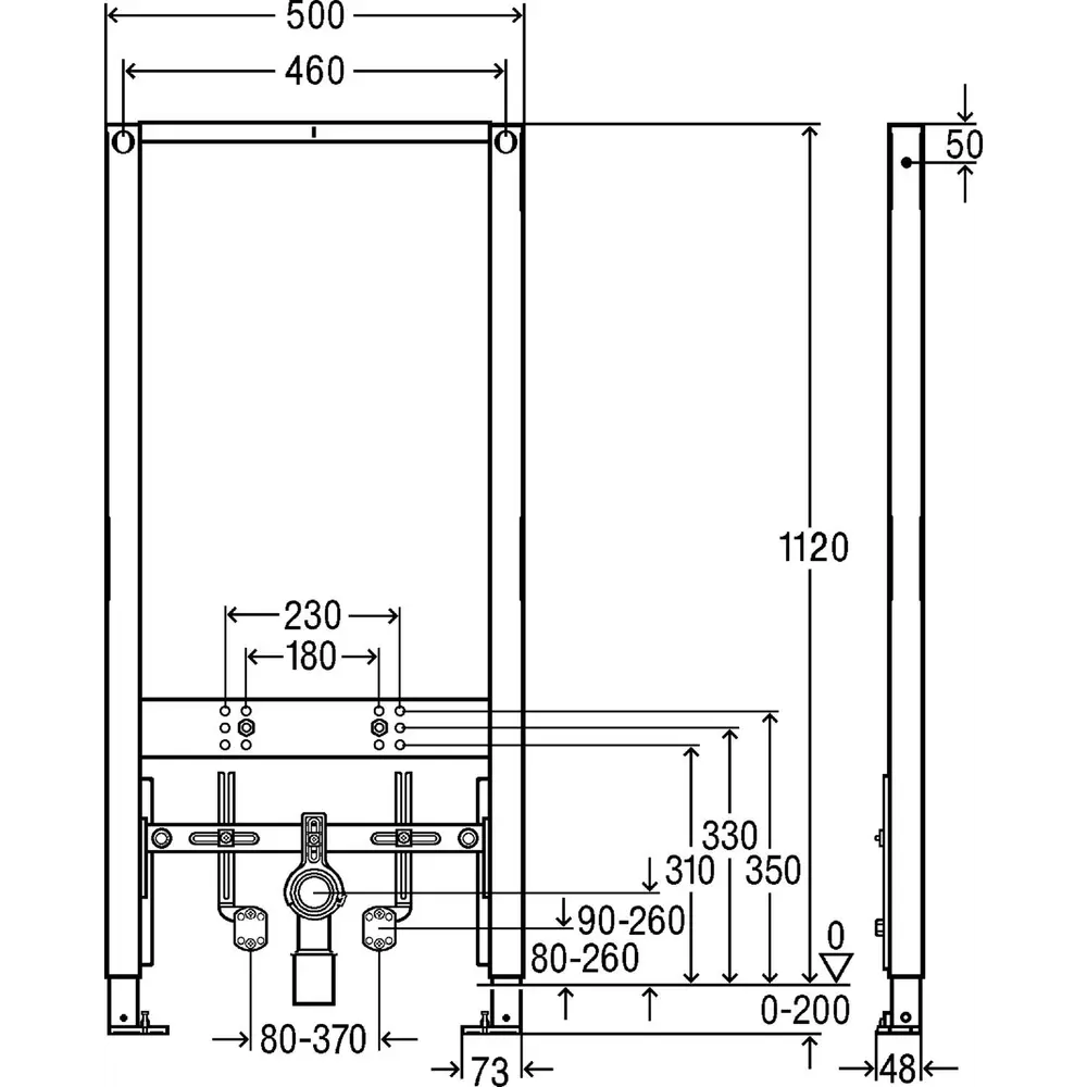- рама (30х30) с порошковым напылением, бачок скрытого монтажа 3H, соединительный комплект для унитаза, крепления, выдвижные фиксируются опоры для регулировки высоты, подключение воды R½ с задней стороны, регулируемое по глубине соединительная колено для унитаза DN90 из PP, эксцентриковый переходник DN90 / 100 с РР
