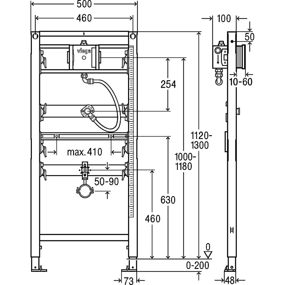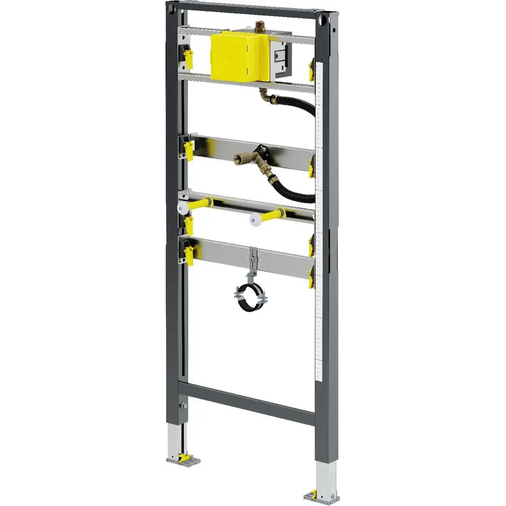 - рама (30х30) с порошковым напылением, бачок скрытого монтажа 3H, соединительный комплект для унитаза, крепления, выдвижные фиксируя опоры для регулировки высоты, подключение воды R½ с задней стороны, регулируемое по глубине соединительная колено для унитаза DN90 из PP, эксцентриковый переходник DN90 / 100 с РР