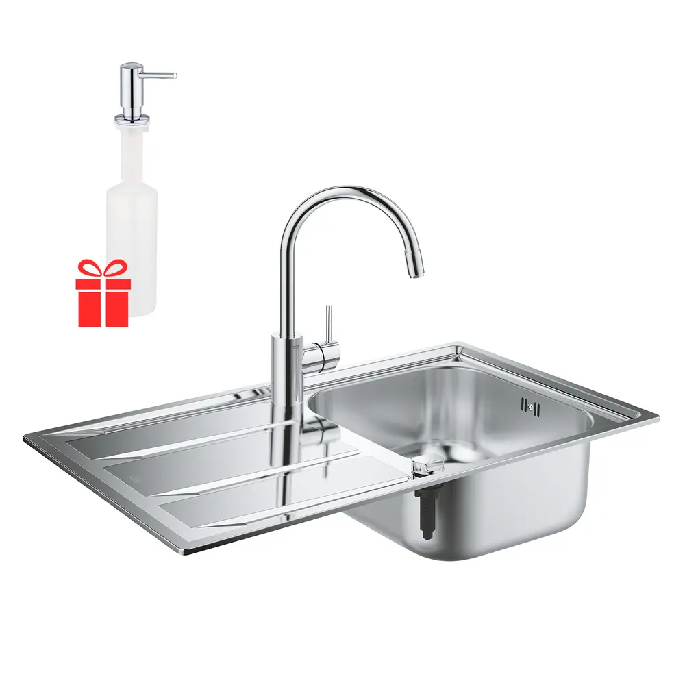 Набор Grohe мойка кухонная K400 31570SD0 + смеситель Concetto 32663001 + дозатор для моющего средства Contemporary 40536000 станет незаменимым атрибутом любой современной кухни. Устойчивость к повреждениям и чистящих средств, а также долговечность мойки является результатом качественной нержавеющей стали, толщиной 1 мм. Удобный смеситель с углом поворота на 360 ° C позволит расширить функциональность данной кухонной зоны. Удобный дозатор решит проблему хранения моющего средства.