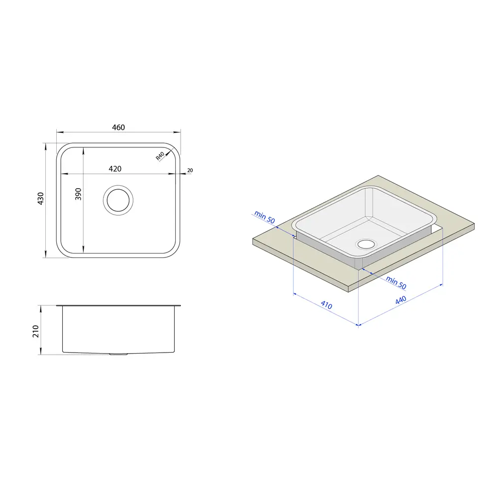 З розмірами чаші 41*38 см мийка відмінно інтегрується у будь-який дизайн сучасної кухні. Вона може бути монтована під стільницею або як накладна комплектується всім необхідним для встановлення.