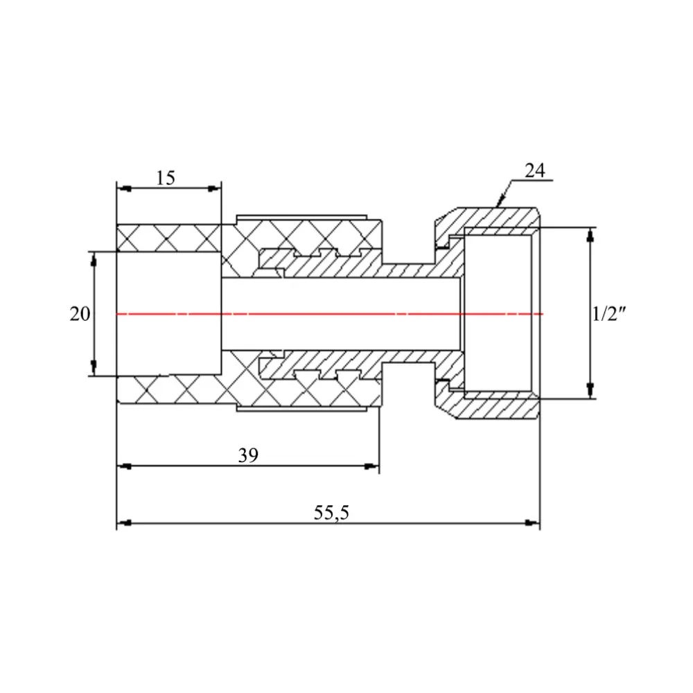 Муфта PPR Blue Ocean з накидною гайкою 20х1/2" ВР служить для з‘єднання поліпропіленової труби зі сталевою або з елементом інженерної системи з нарізним підключенням. Вона складається з поліпропіленового корпусу з внутрішньою трубною різьбою з латуні діаметром 1/2" і накидної шестигранної гайки. Зі зворотного боку розташований вихід з діаметром 20 мм для підключення методом зварювання. Завдяки матеріалу виготовлення виріб швидко нагрівається та не прилипає до насадок паяльника.