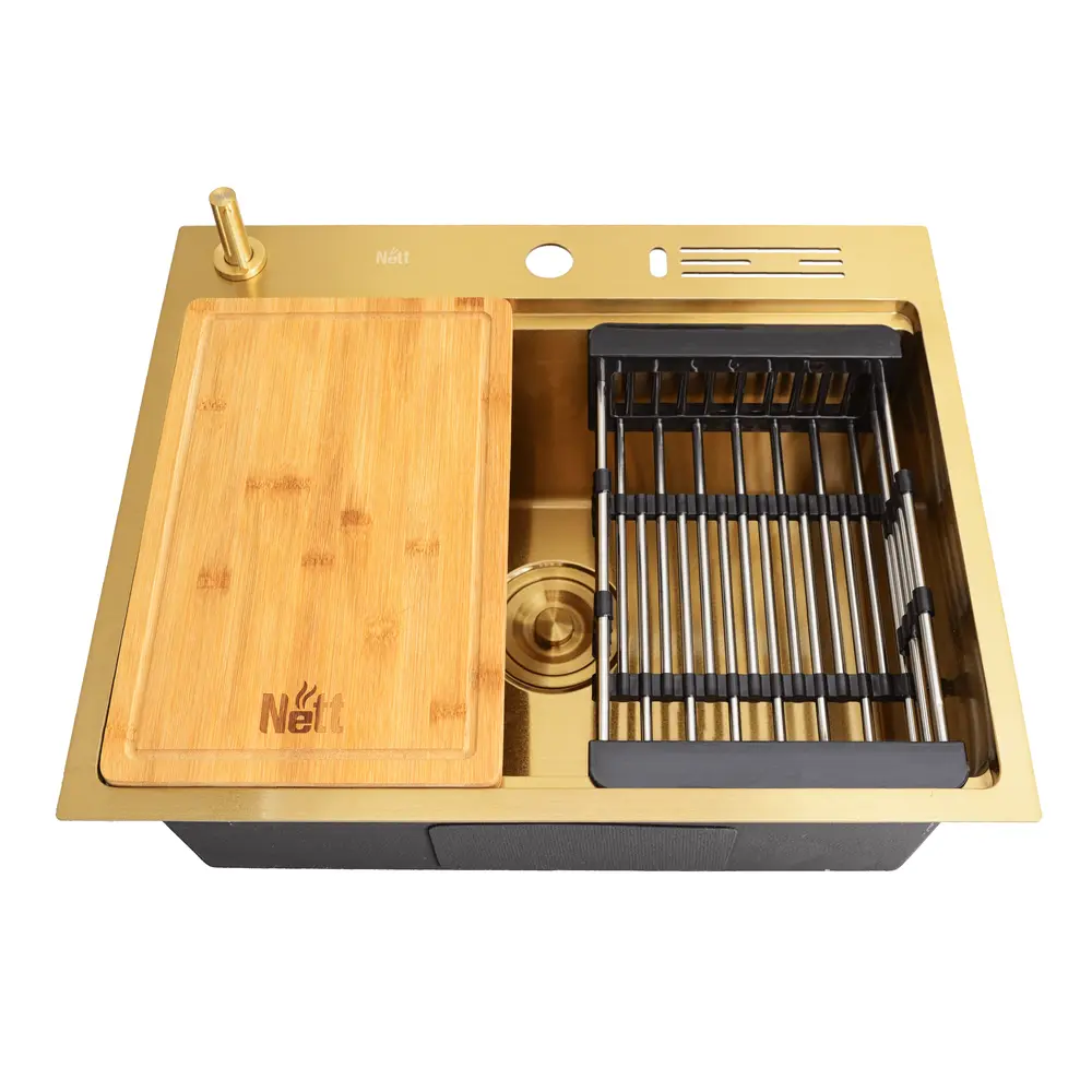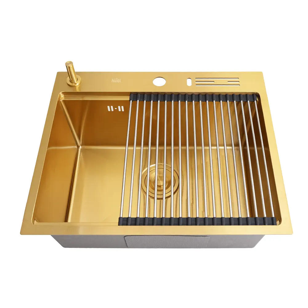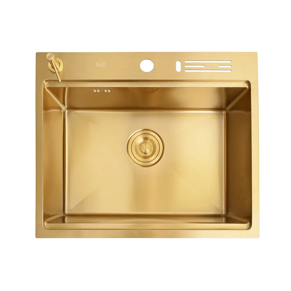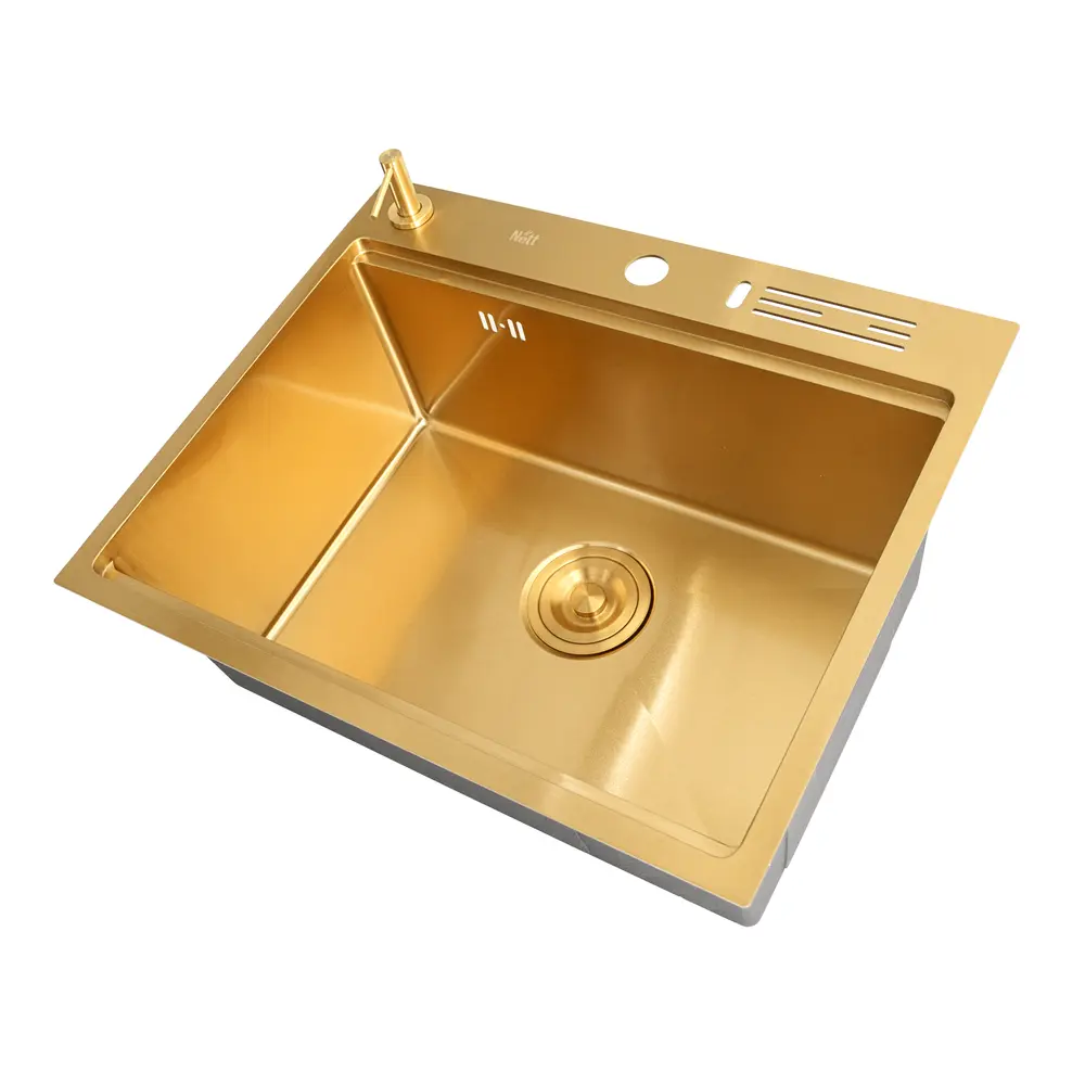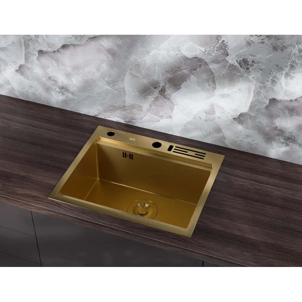 Розгляньте можливість вибору врізної мийки із золотим Nano-покриттям, яке продовжить захищати метал навіть при випадкових пошкодженнях.