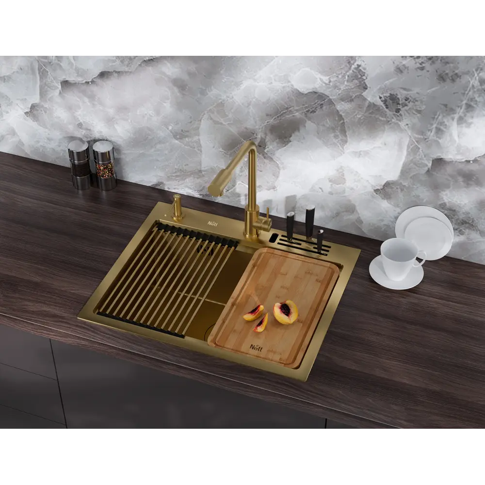 Елегантна кухонна раковина золотого відтінку перетвориться на вишуканий акцент інтер'єру вашої кухні, радуючи очі протягом багатьох років.
