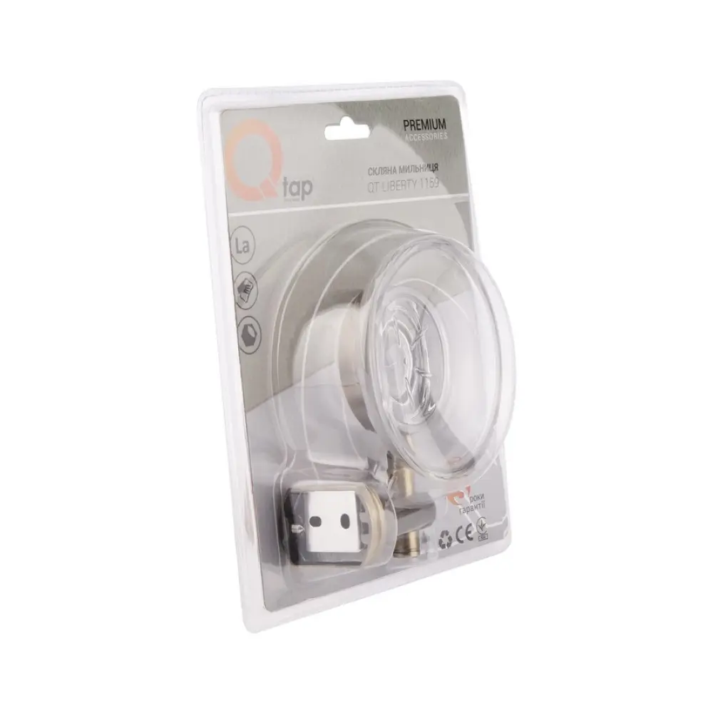 Мильниця Qtap Liberty ANT 1159 надійно кріпиться до стіни, складається з тримача та скляної чаші. Виріб не піддається корозії. Мильниця знімна, завдяки чому догляд за нею буде простим і легким. У виробі використовується кільце ущільнювача (прокладка), необхідне для щільного з‘єднання металу і скла, які також перешкоджають виникненню шуму в результаті зіткнення частин виробу. На тримач нанесено фірмовий логотип компанії.