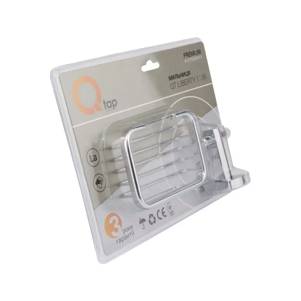 Мильниця Qtap Liberty CRM 1156 надійно кріпиться до стіни, складається з тримача та гратчастої чаші прямокутної форми, тому вода стікає, а мила вистачає надовше. Виріб не піддається корозії. На тримач нанесено фірмовий логотип компанії.