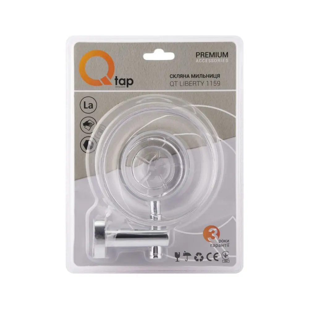 Мильниця Qtap Liberty CRM 1159 надійно кріпиться до стіни, складається з утримувача та скляної чаші. Виріб не піддається корозії. Мильниця знімна, завдяки чому догляд за нею буде простим та легким. У виробі використовується кільце ущільнювача (прокладка), необхідне для щільного з‘єднання металу і скла, які також перешкоджають виникненню шуму в результаті зіткнення частин виробу. На тримач нанесено фірмовий логотип компанії.