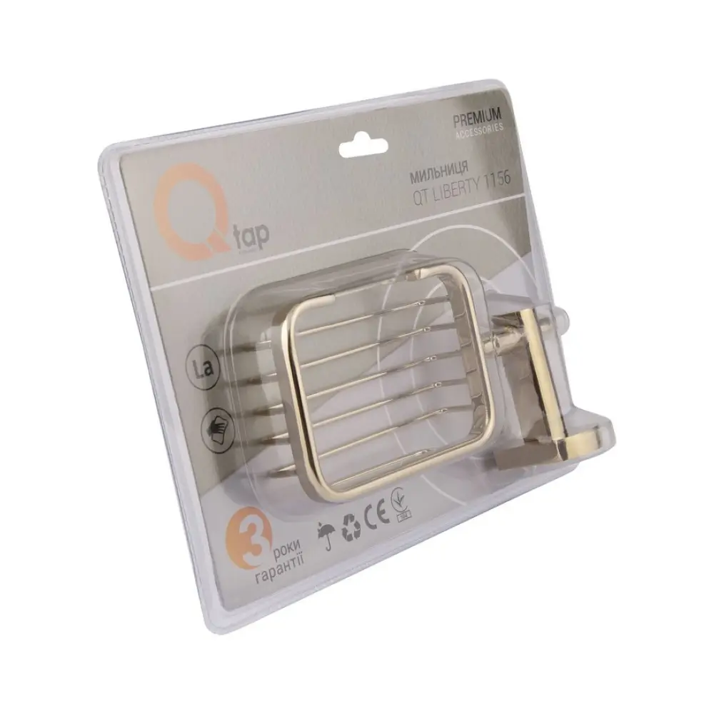 Мильниця Qtap Liberty ORO 1156 надійно кріпиться до стіни, складається з тримача та гратчастої чаші прямокутної форми, тому вода стікає, а мила вистачає надовше. Виріб не піддається корозії. На тримач нанесено фірмовий логотип компанії.