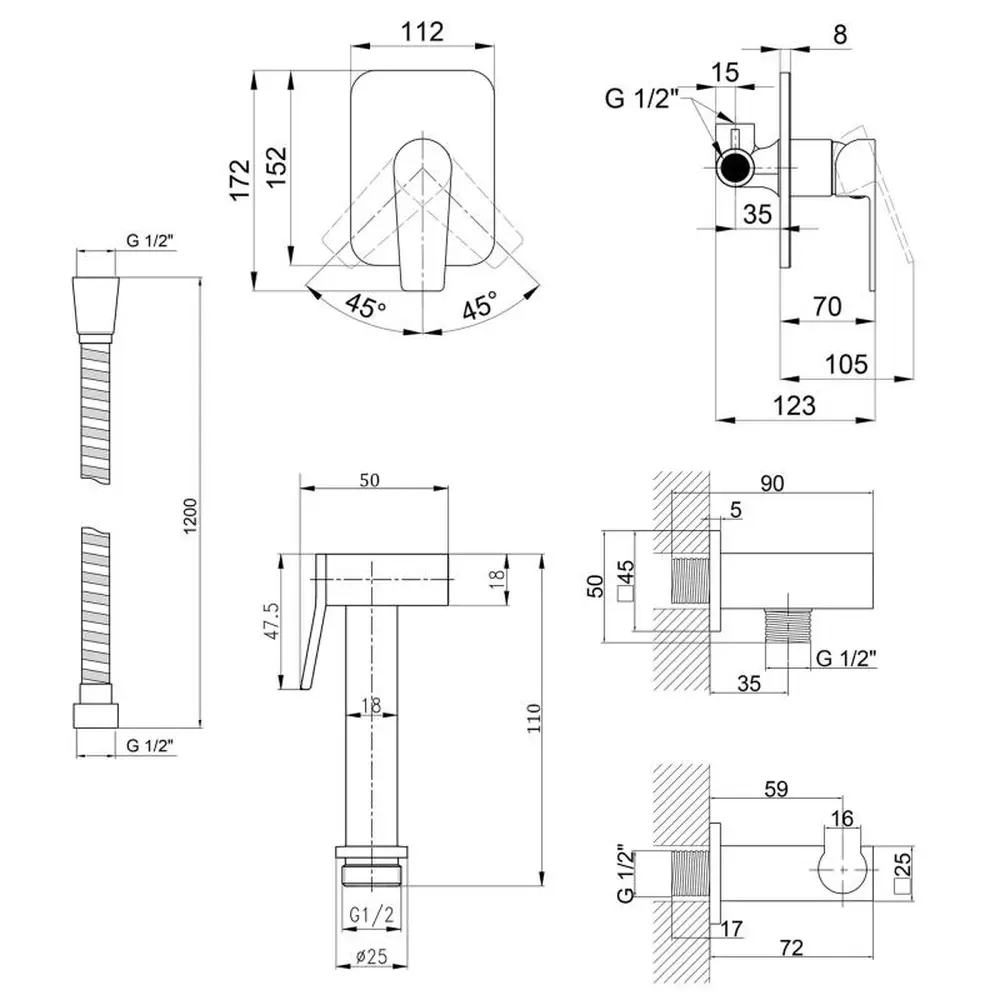 Лійка для гігієнічного душу, змішувач прихованого монтажу, шлангове з‘єднання з вбудованим тримачем лійки, душовий шланг, кріплення.