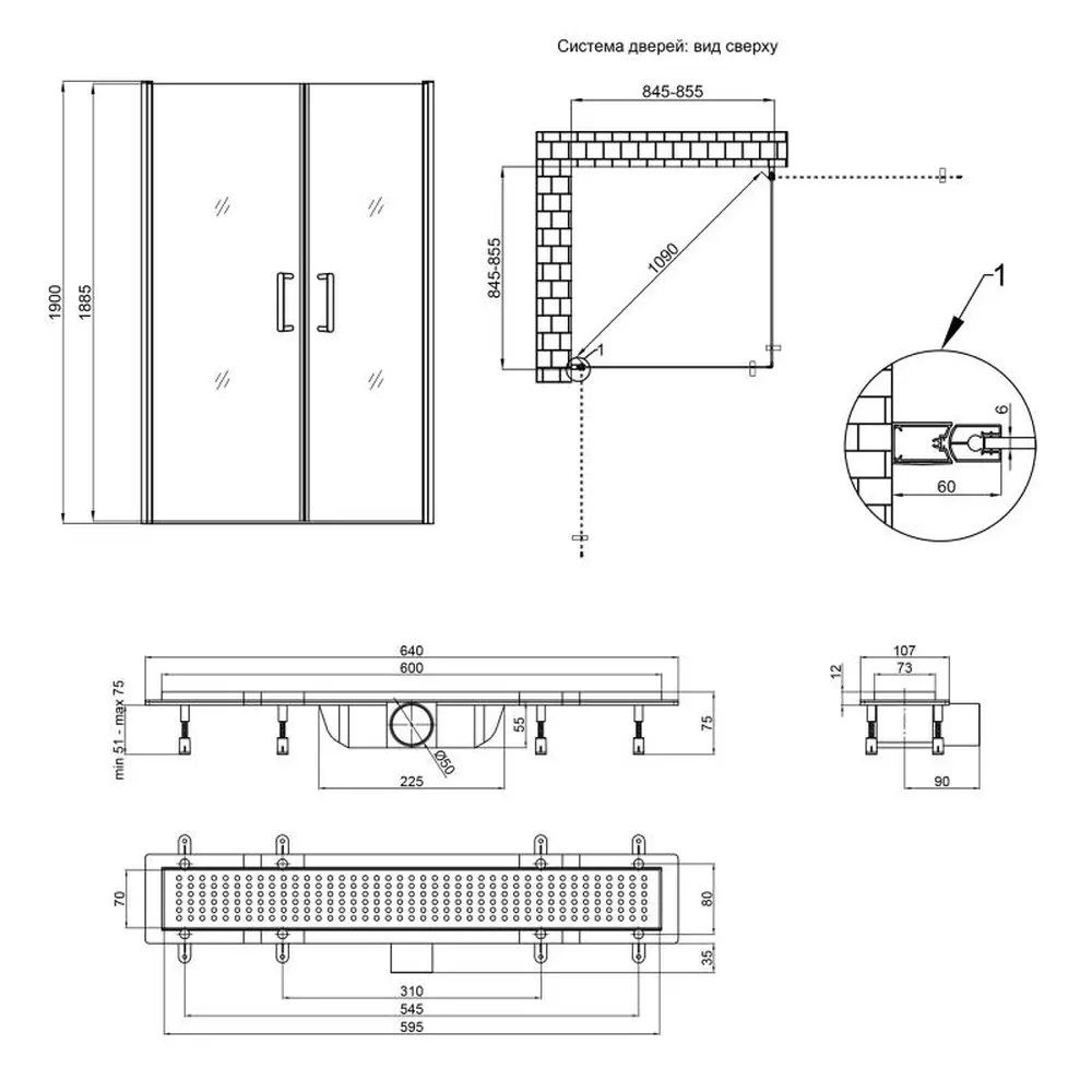 Душова кабіна: 1900х845-855х845-855. Трап: 75х640х142