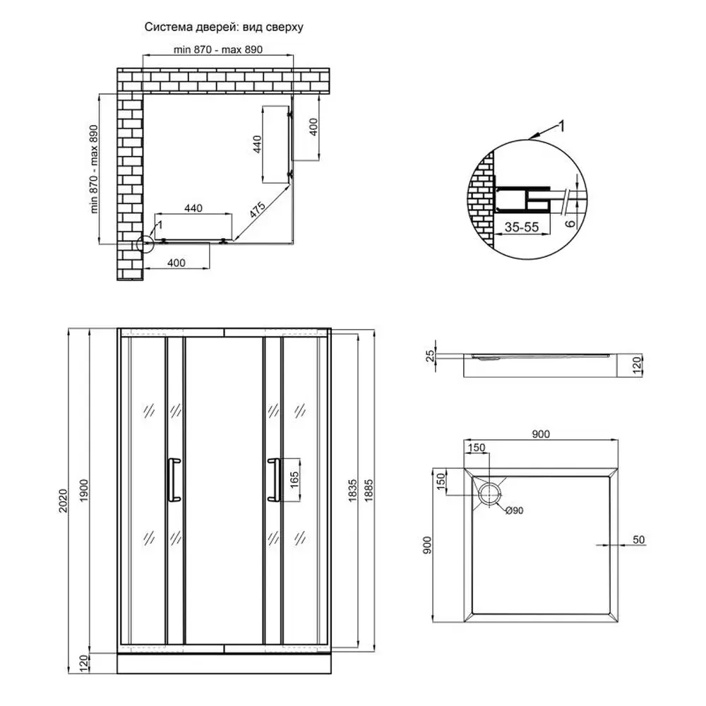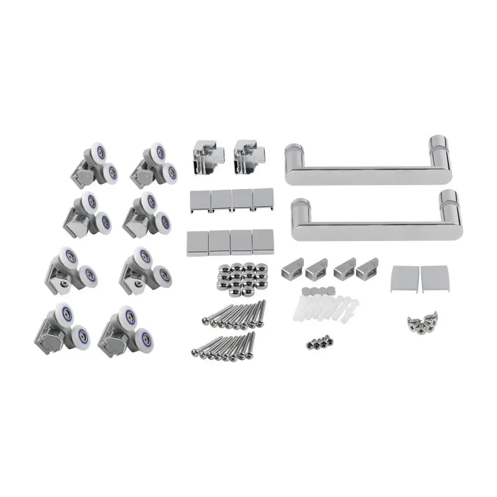 Піддон, сифон, подвійні ролики, ручки, верхній профіль, нижній профіль, бічні профілі, набір ущільнювачів, розширювальні профілі, 2 скляні двері, 2 глухих скла, заглушки, з‘єднувальні елементи, фіксатори, ніжки, комплект кріпильних деталей.