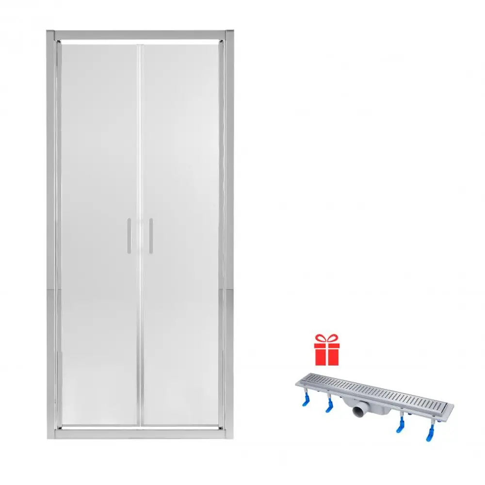Попередньо встановлені скляні двері з профілем, ручки, набір ущільнювачів, розширювальні профілі, заглушки, комплект кріпильних деталей, трап з гратами, ніжки, ущільнювальна стрічка.