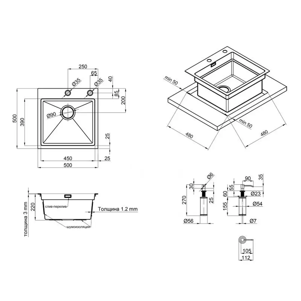 Мийка, сифон, слив/перелив, кошиковий вентиль, сушарка для посуду, дозатор, кріплення.