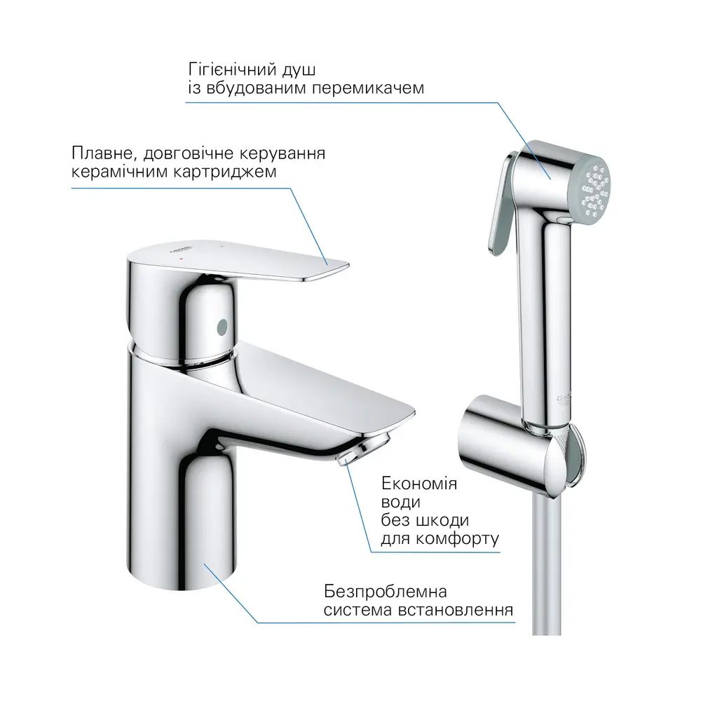 Набор для гигиенического душа со смесителем Grohe QuickFix StartEdge S-Size 23773001 – идеальное решение для современной ванной комнаты. Он состоит из смесителя для биде и лейкой для гигиенического душа. Устройство оснащено керамическим картриджем Longlife, который имеет ограничитель температуры и точный контроль напора воды с помощью цельнометаллического рычага. Смеситель имеет глянцевую хромированную поверхность, которая устойчива к царапинам и обеспечивает долговечность. В комплект поставки входят гибкие шланги 3/8". Такое изделие станет настоящей находкой для ванной комнаты.