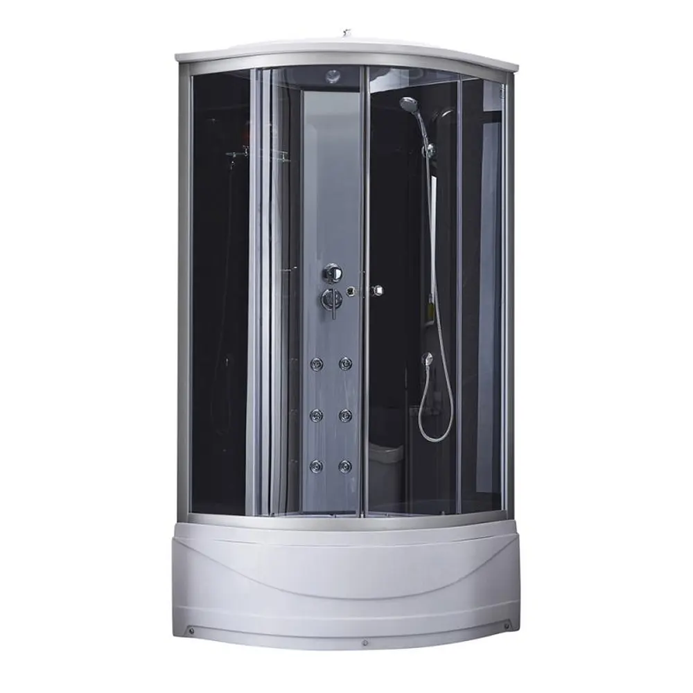 Піддон, сифон, двері, ручки, ролики, профіль, задні стінки, душова панель з гідромасажними форсунками, змішувач, лійка для ручного душу, лійка для верхнього душу, душовий шланг, кронштейн для ручного душу, шлангове підключення, ніжки, комплект кріплень, підлога .